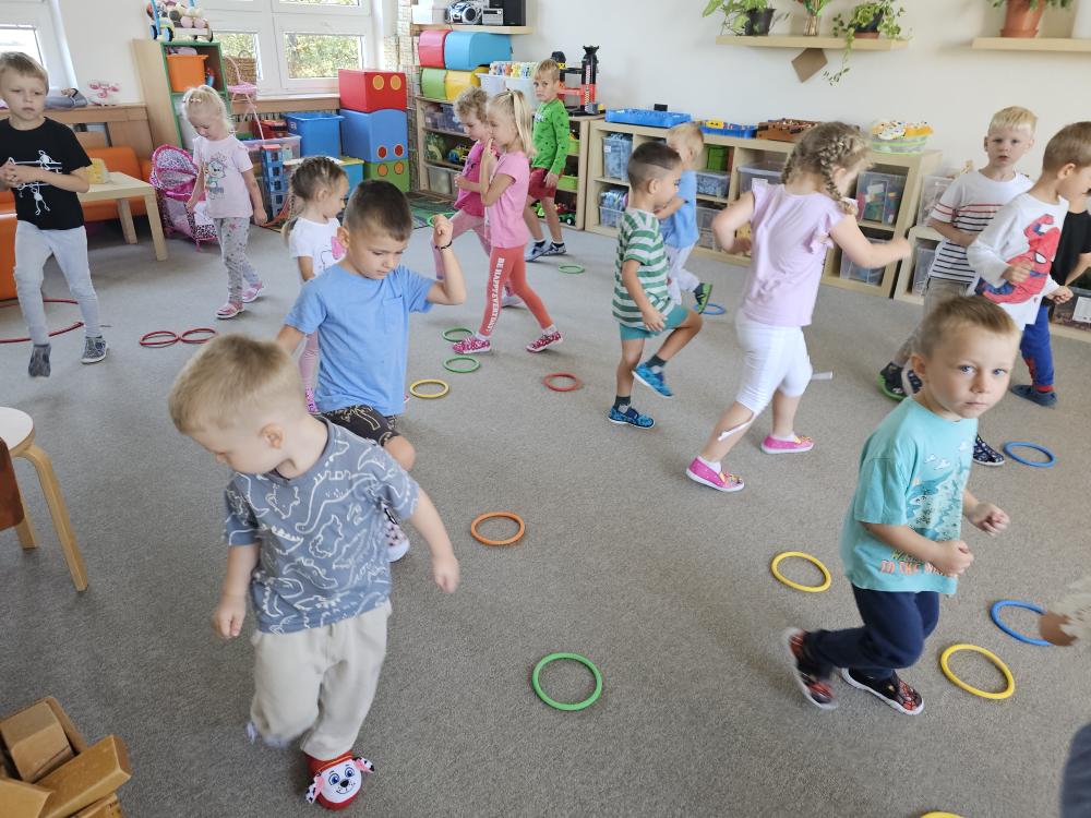 Seznámili jsme se s hračkami ve třídě a se všemi kamarády jsme si zase hráli velmi rádi. S barevnými kroužky jsme cvičili celý týden. Procvičili jsme si barvičky, různá přirozená cvičení, pohyb s vyhýbáním se a ve hře Všichni domů, pohotovou orientaci a rozhodnost.