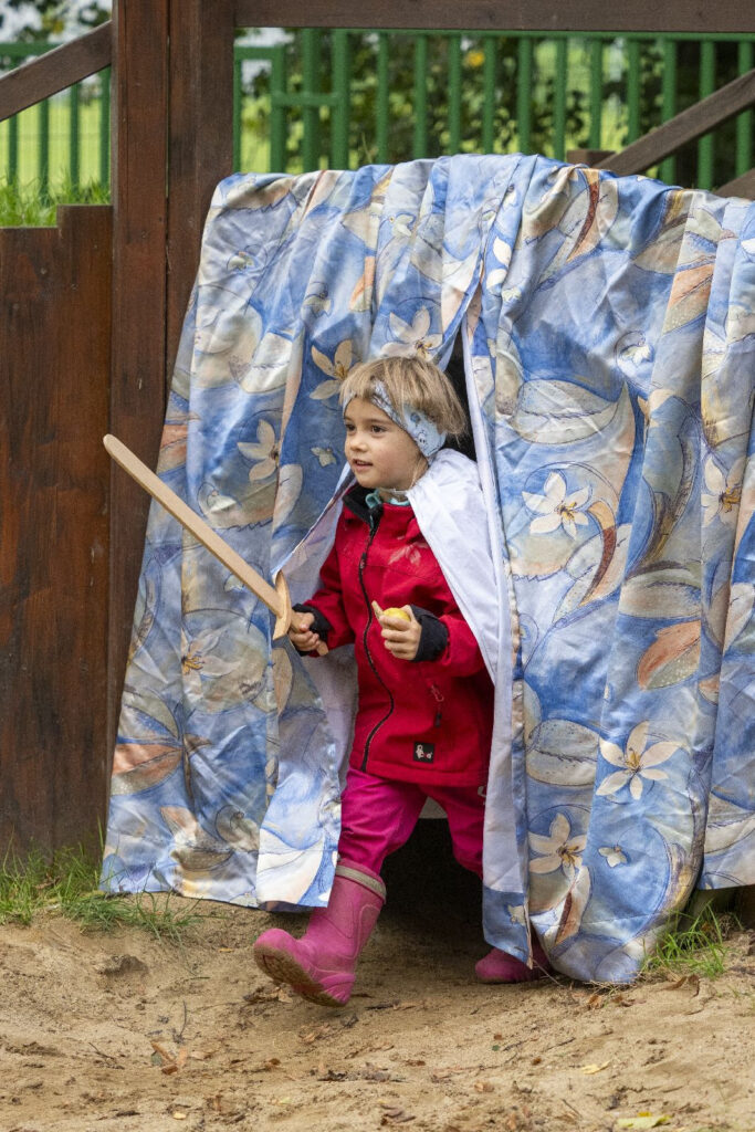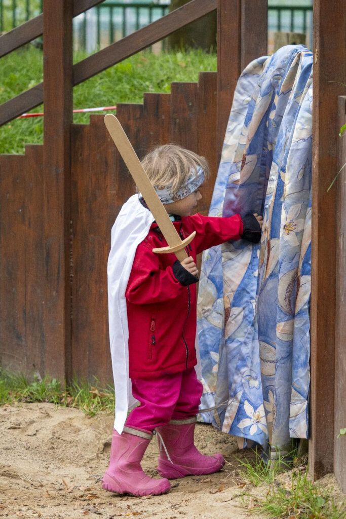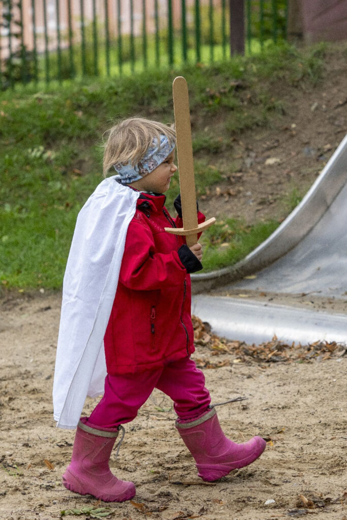Michaelskou slavnost slavíme dopoledne, bez rodičů, neboť od dětí vyžaduje značnou odvahu. Dopoledne jsme šli na zahradu MŠ k jeskyni, kde spí drak. Cestu mohl projít každý sám či s dalším kamarádem – jak každý potřebuje. Každé dítě dostalo na cestu plášť, meč a sluneční paprsek. Celou dobu cesty jsme společně zpívali píseň „Michael“, která nám dodávala potřebnou sílu a odhodlání. Odměnou za překonání strachu bylo jablíčko a radost z nabité odvahy.