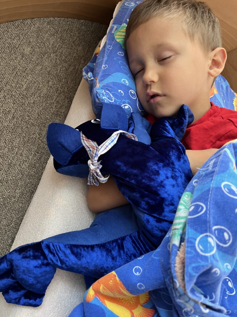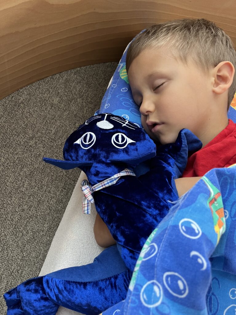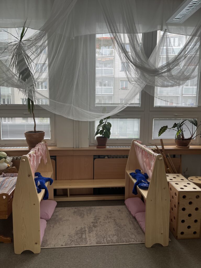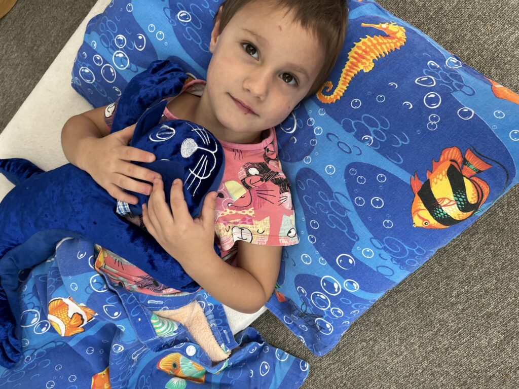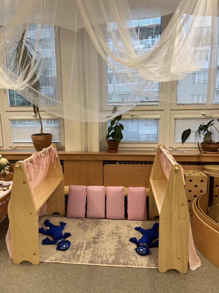 Ve třídě Hvězdičky děti využívají relaxační koutek s vlněným kobercem, polštářky a terapeutickými zátěžovými kočkami. Zátěžové kočky si děti berou k sobě i při odpočinku.