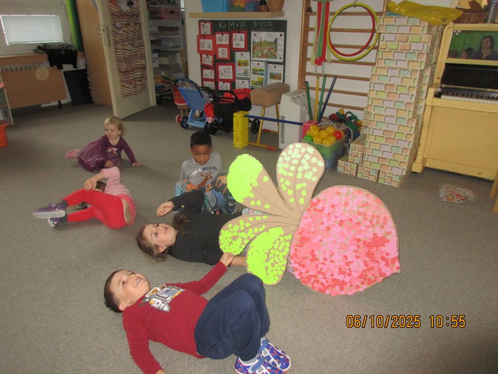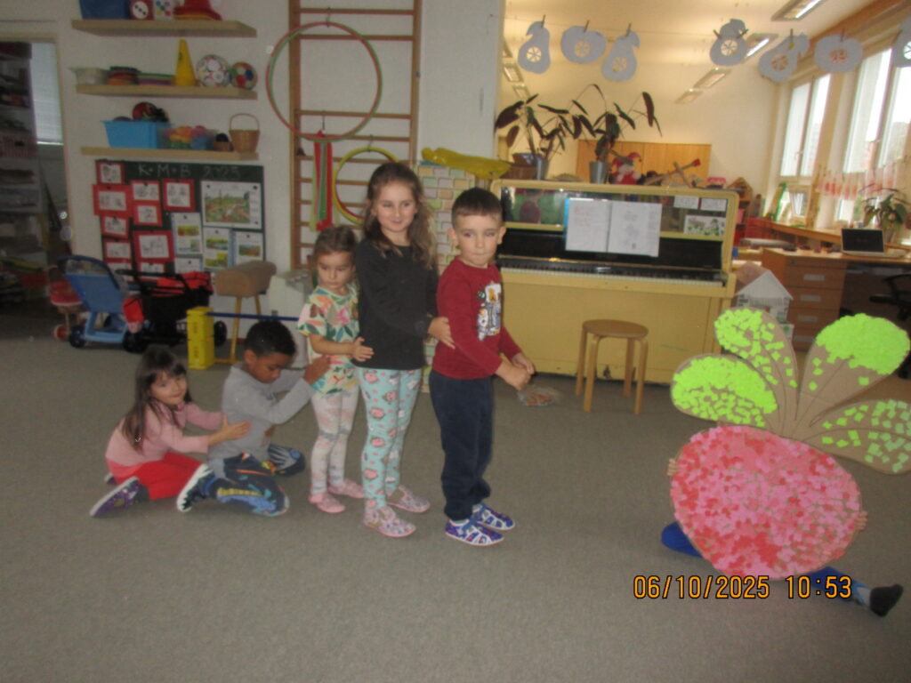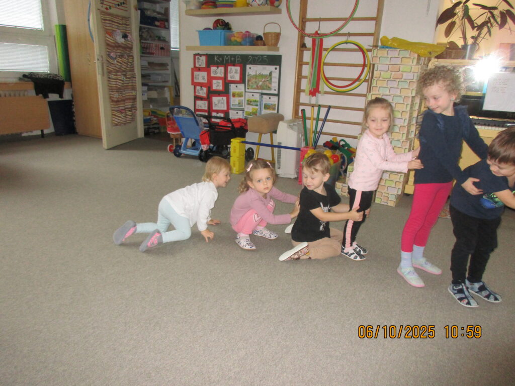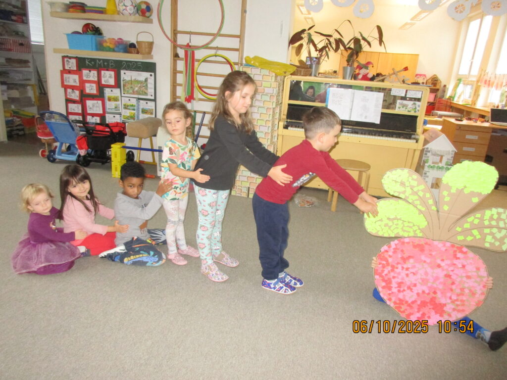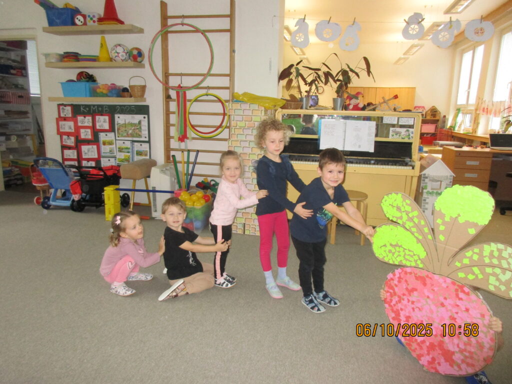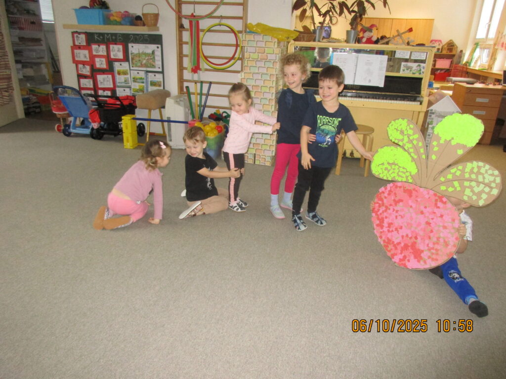 V týdnu, kdy se seznamujeme s úrodou na zahrádkách jsme si zdramatizovali známou pohádku, při které se děti učily užívat přímou řeč, pojmy před, za, mezi, první, poslední.