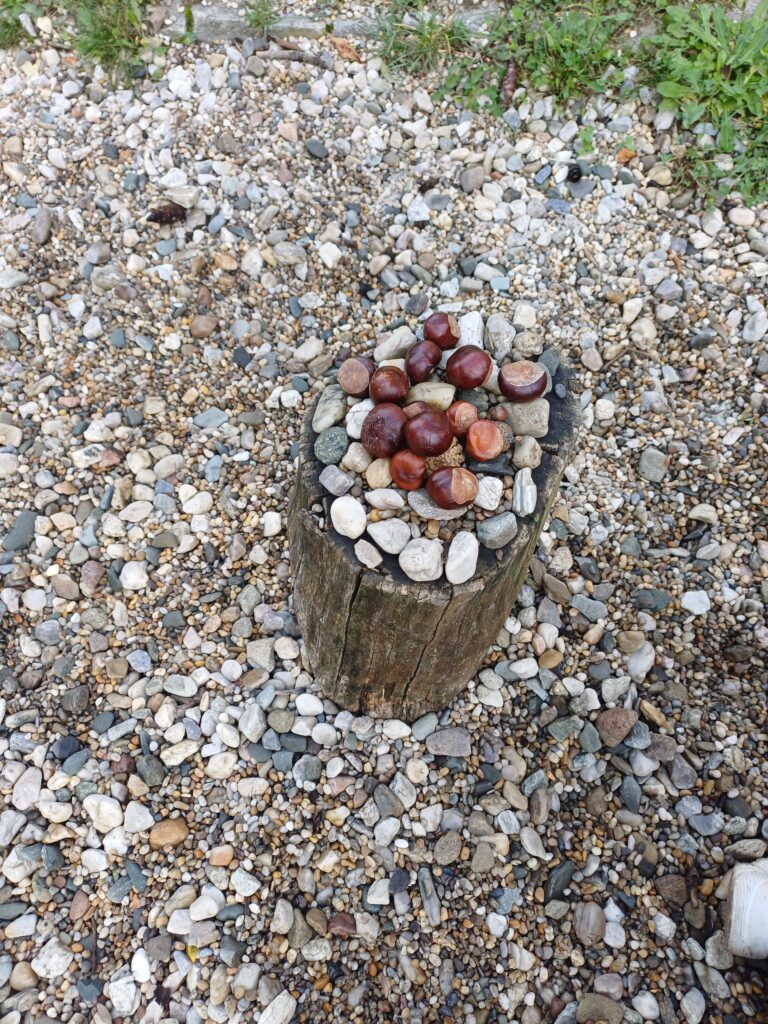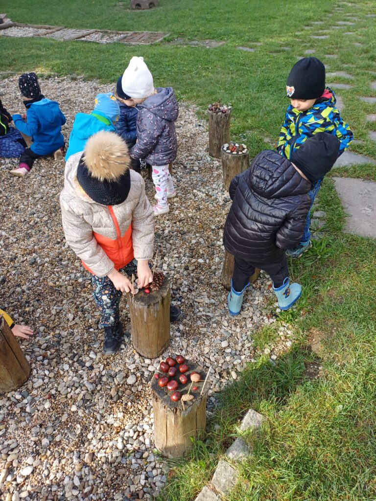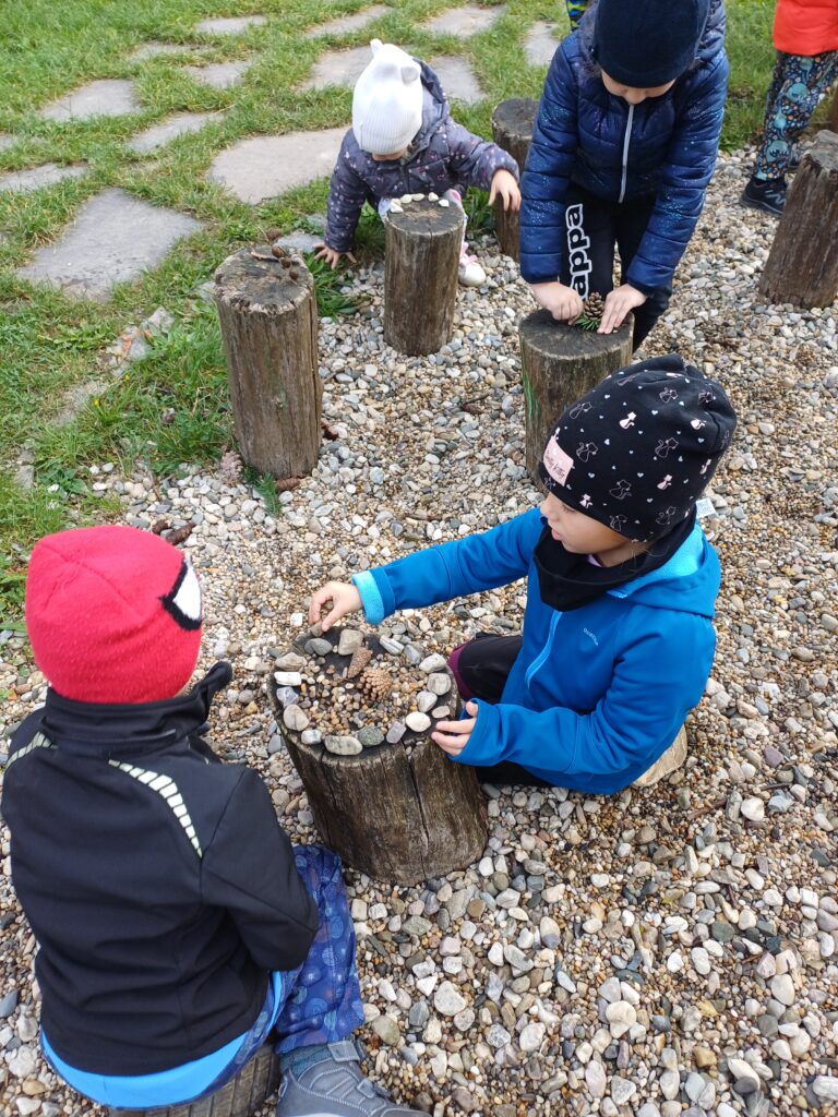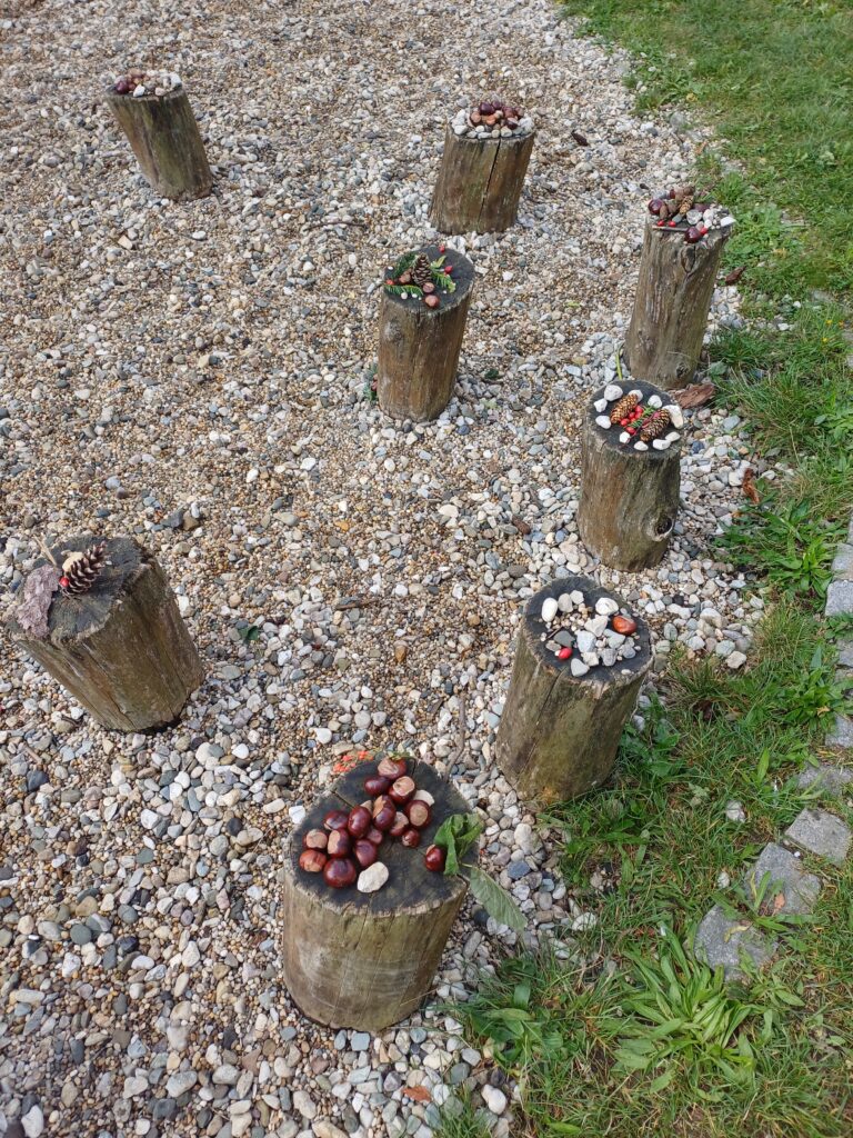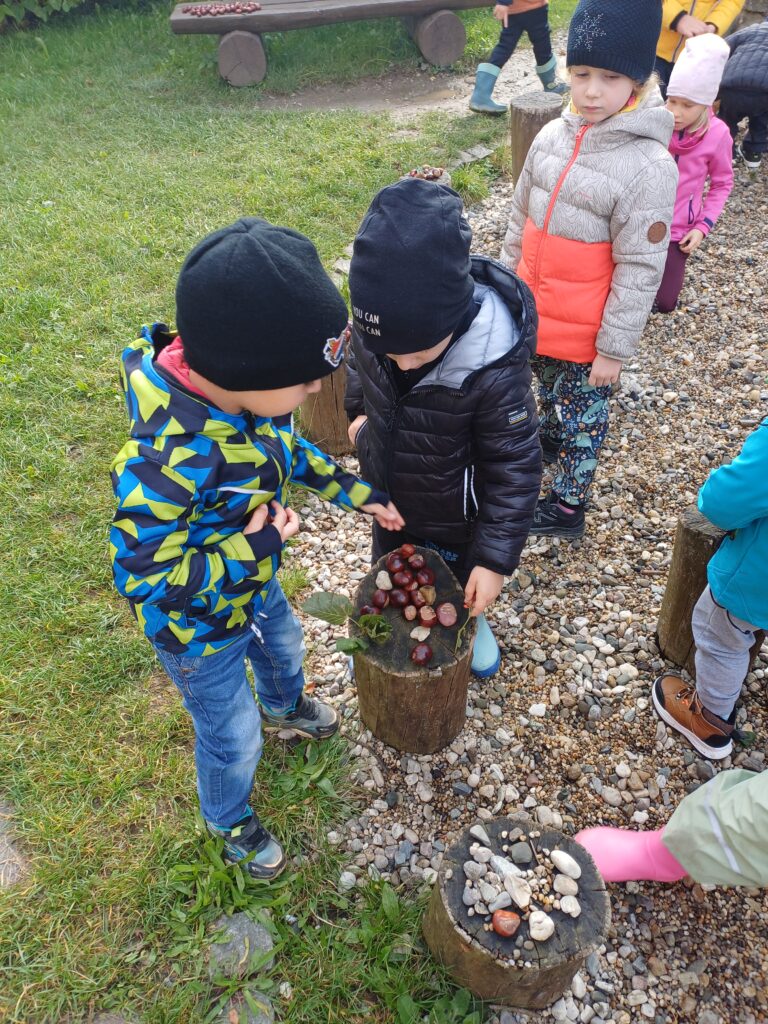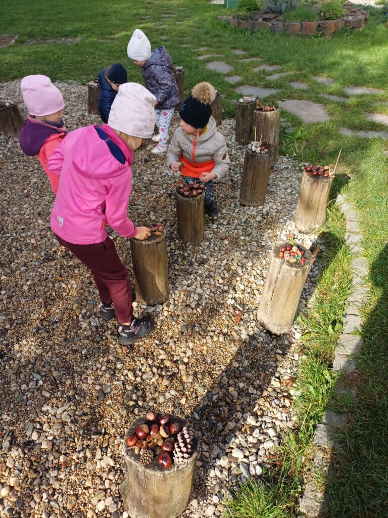 Děti si vyzkoušely tvořit z přírodnin a zároveň tak trochu v přírodě, přesněji na zahradě mateřské školy. Děti použily k tvorbě na zahradě přírodní materiály, které si přinesly cestou do školky k tvoření zeleninových skřítků. Některé přírodniny se k tvorbě zeleninových skřítků nepoužily, proto byl skvělý nápad použít přírodniny k dalšímu tvoření.