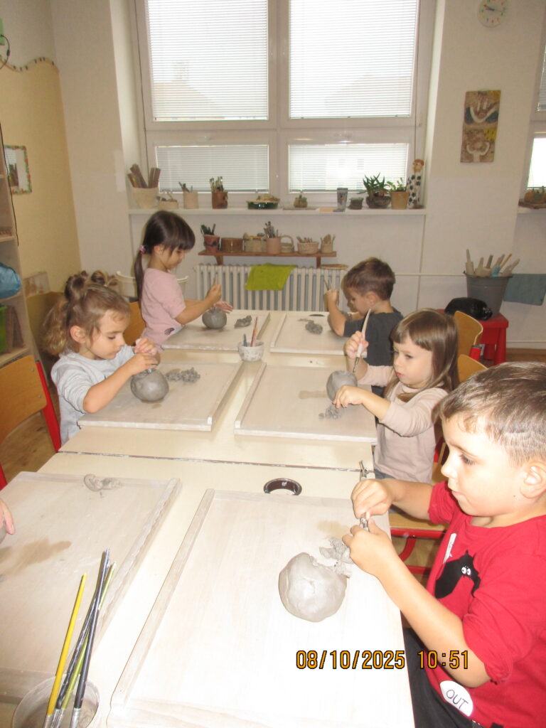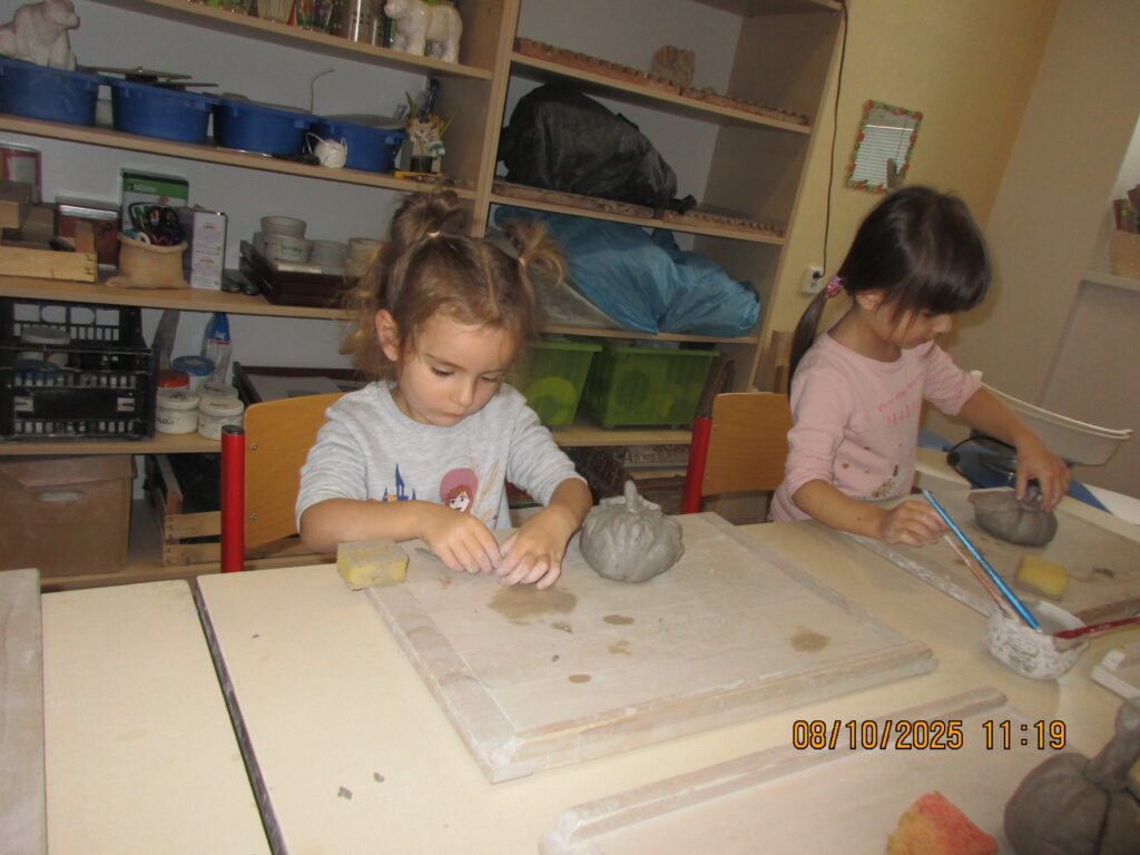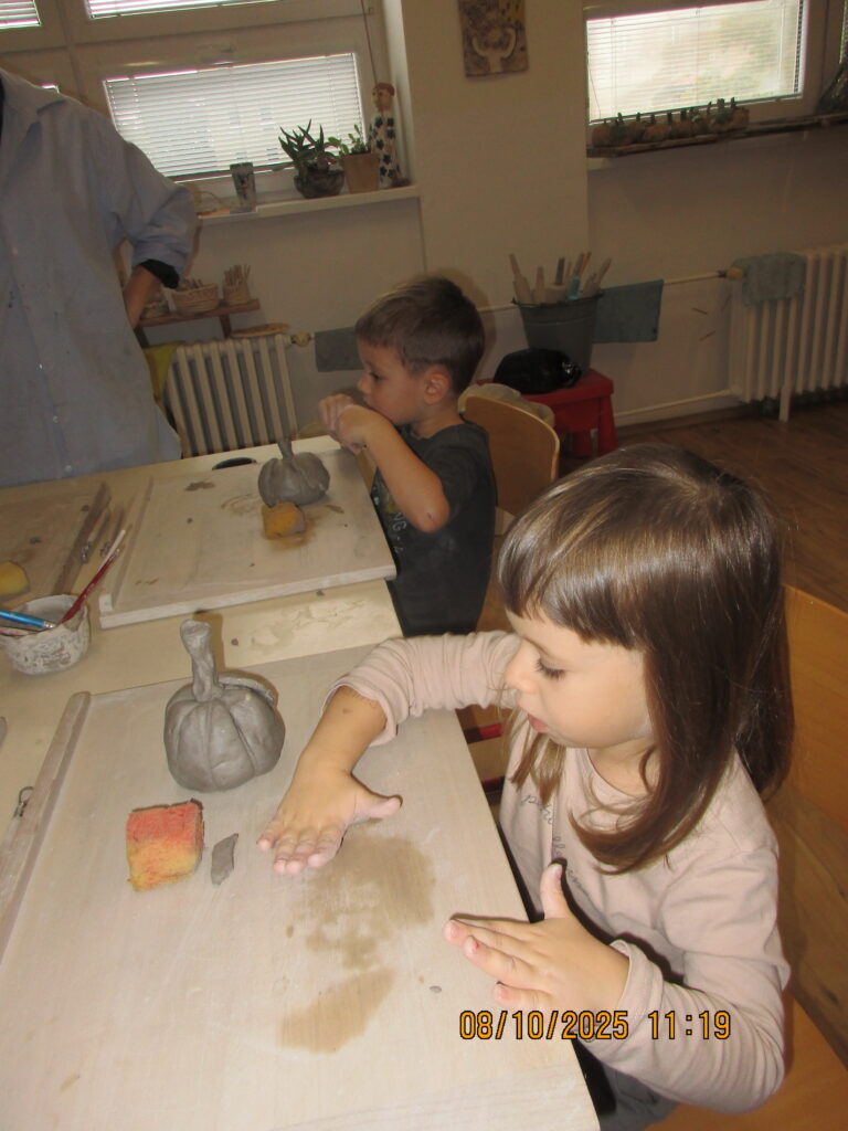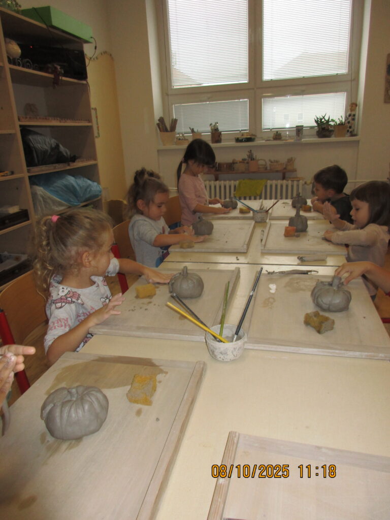V tomto školním roce jsme navštívili kroužek keramiky v Korunce, pro mnohé to bylo něco nového, byly tam poprvé. Seznámily se s prostředím, milou paní keramičkou a materiálem-modelovací hlínou. Děti vyráběly dýni a že jim to šlo.