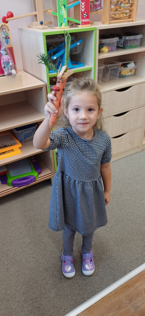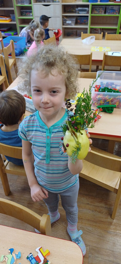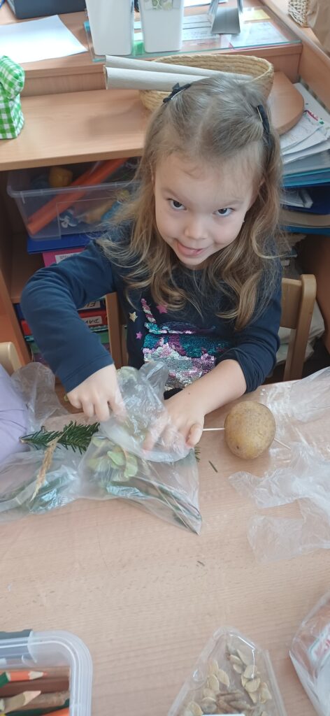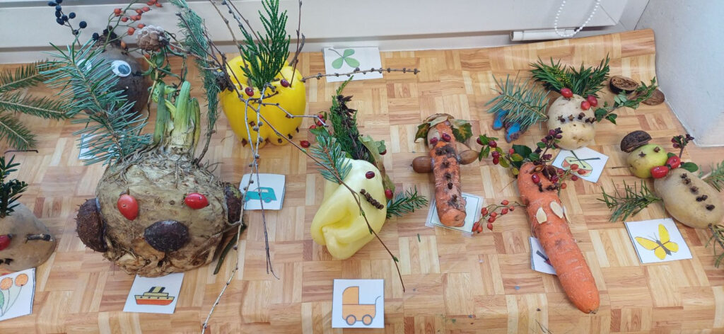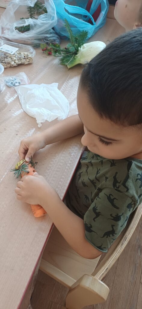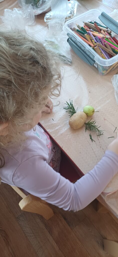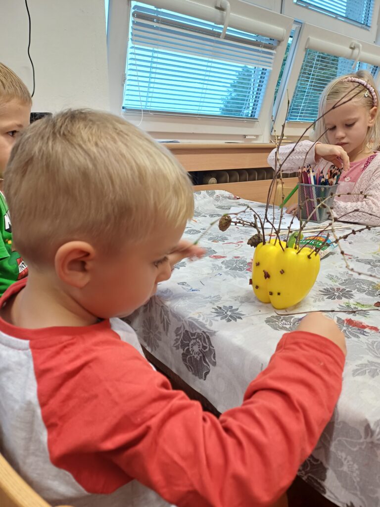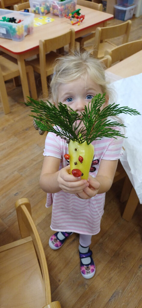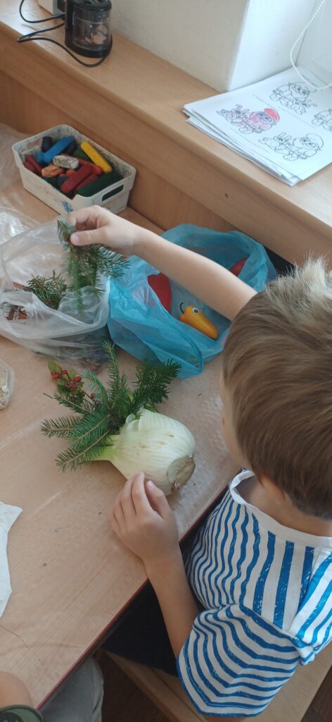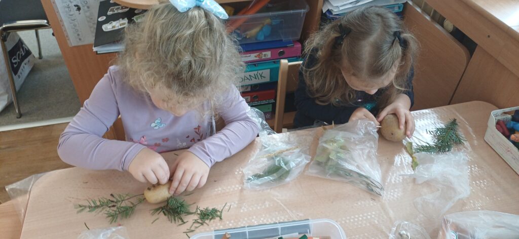 V týdnu plném zeleniny a ovoce jsme si společně povyprávěly o zelenině, kterou děti přinesly do školky. Zeleninu jsme společně omyli a připravili k tvorbě. Na zahradě si děti nasbíraly nejrůznější přírodniny – klacíky, větvičky, slupky od kaštanů. Některé děti cestou do školky našly nějaké přírodniny, tak je také přinesly a použily k tvoření. Maminky nám nabídly i k tvoření koření, které používají v kuchyni.