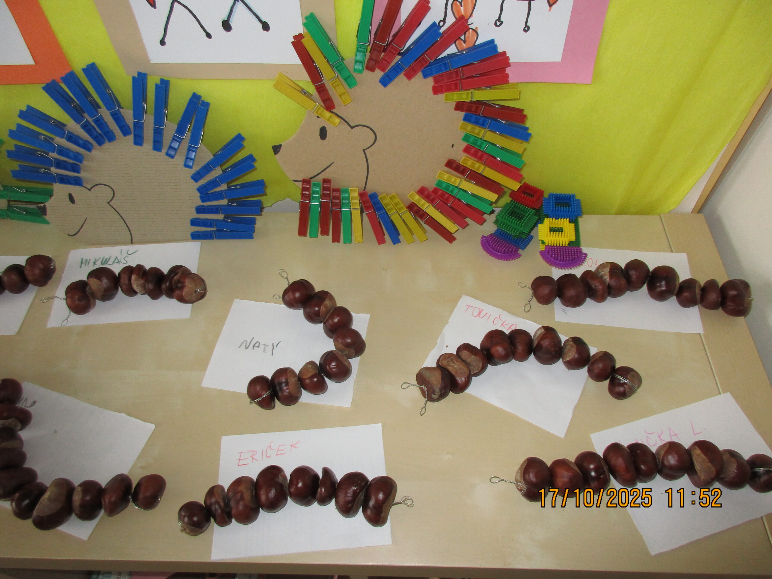 Kaštánkové housenky pro ježka(/Berušky) 21. 10. 2025 Na školkové zahradě jsme posbírali kaštánky a rozvíjely jemnou motoriku při navlékání kaštanů.