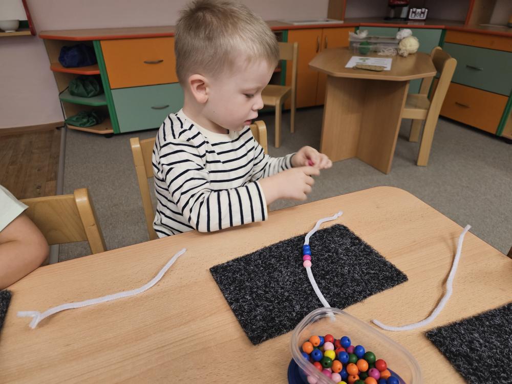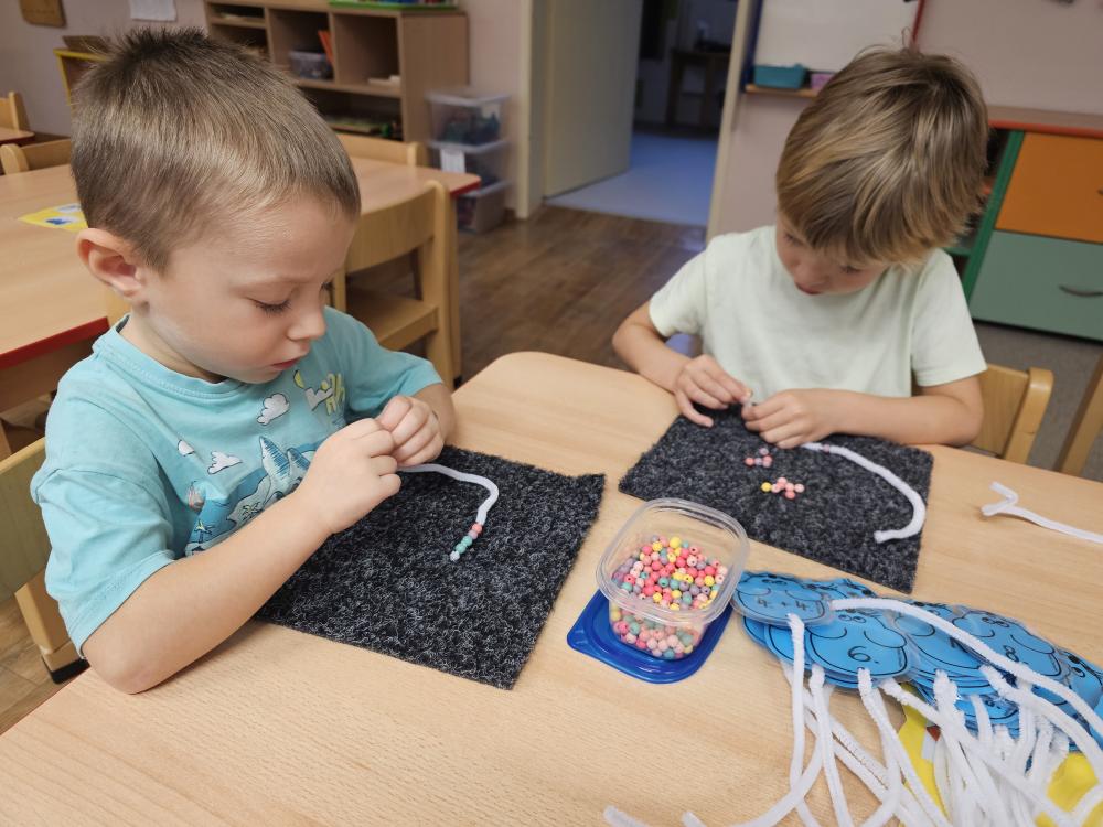 V týdnu Broučkiády a s tématem: Uspávání broučků jsme se věnovali logickému myšlení a počítání. Modrým myškám a kamarádkám broučkům jsme zdobili ocásky barevnými korálky, podle čísla nebo počtu teček, které měla myška uvedené na zádech. Nejen, že jsme si procvičili číslo a postupnost, ale prstíky nelenošily a rozvíjely si jemnou motoriku. Starší děti si procvičily pojmy uber a přidej, taktéž sčítání a někteří zvládli i násobky.