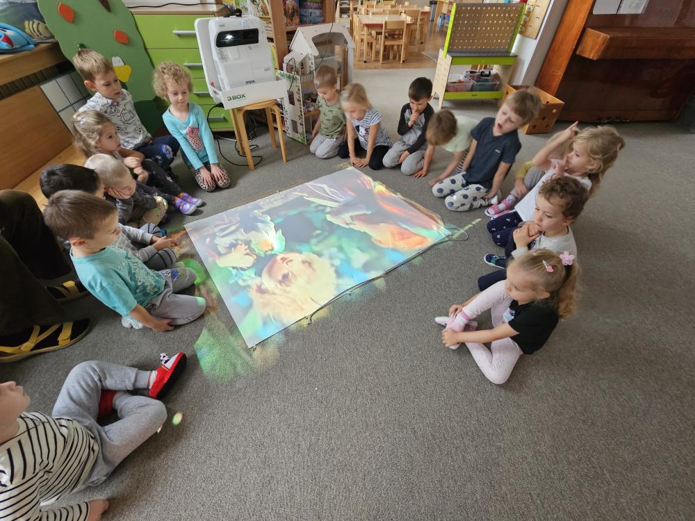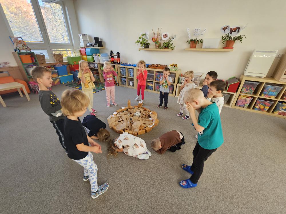 U broukoviště jsme si pak zahráli pohybovou hru: ,, Broučku, vstávej! “ Procvičili jsme si pojmy tiše a nahlas.