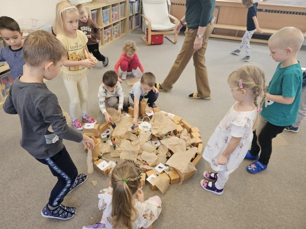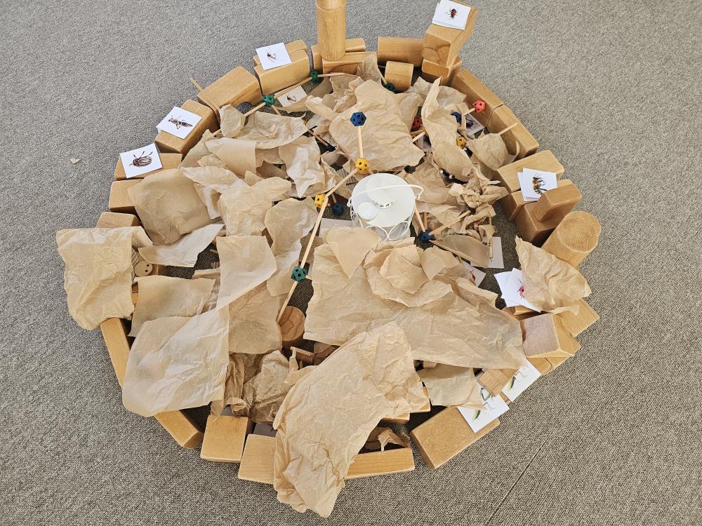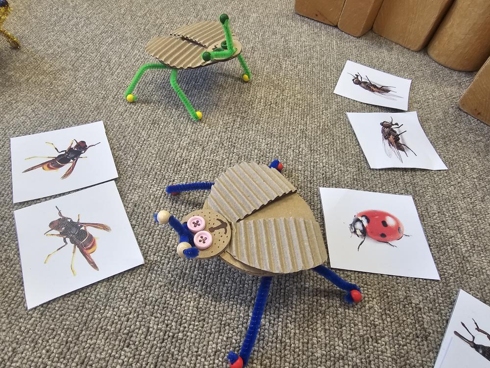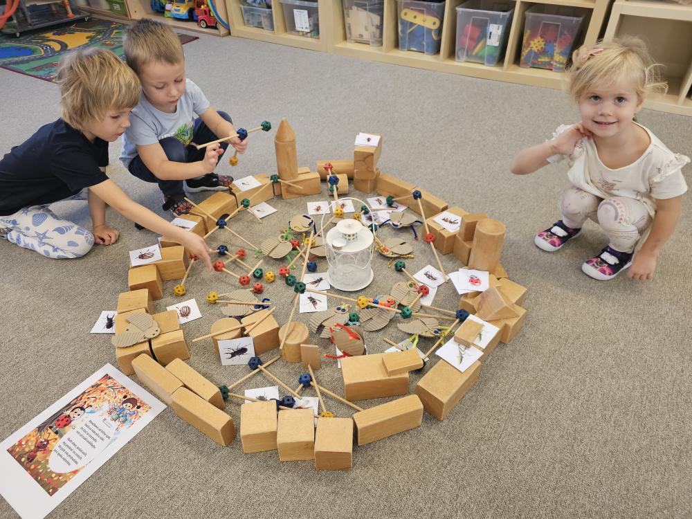 Nejprve jsme vytvořili broučky a společným hodnocením jsme je slovně ocenili, jak na nás působí jejich pohyb – vesele, unaveně, sportovec, vtipálek apod. Posléze jsme jim stavěli obydlí z kostek. Další den jsme vytvářeli z jedné tyčkové stavebnice různě velké větve, které jsme společně spojovaly a vytvářely nejrůznější zákoutí pro broučky.