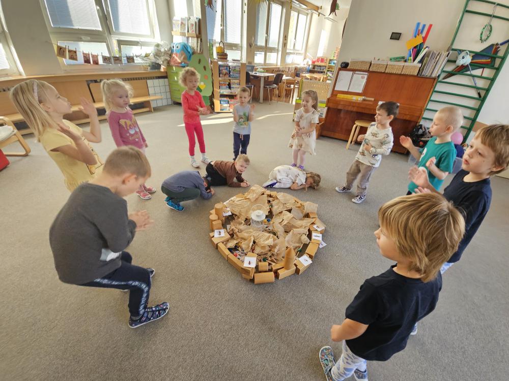 S tématem Uspávání broučku jsme si zrealizovali kooperační činnost stavění broukoviště. Tato činnost je vždy spoluprací více dětí s cílem dosáhnout společného cíle, kdy úspěch jednotlivce je spojen s úspěchem celé skupiny.