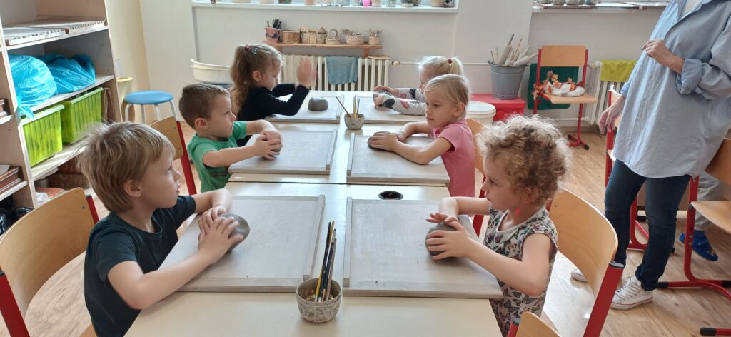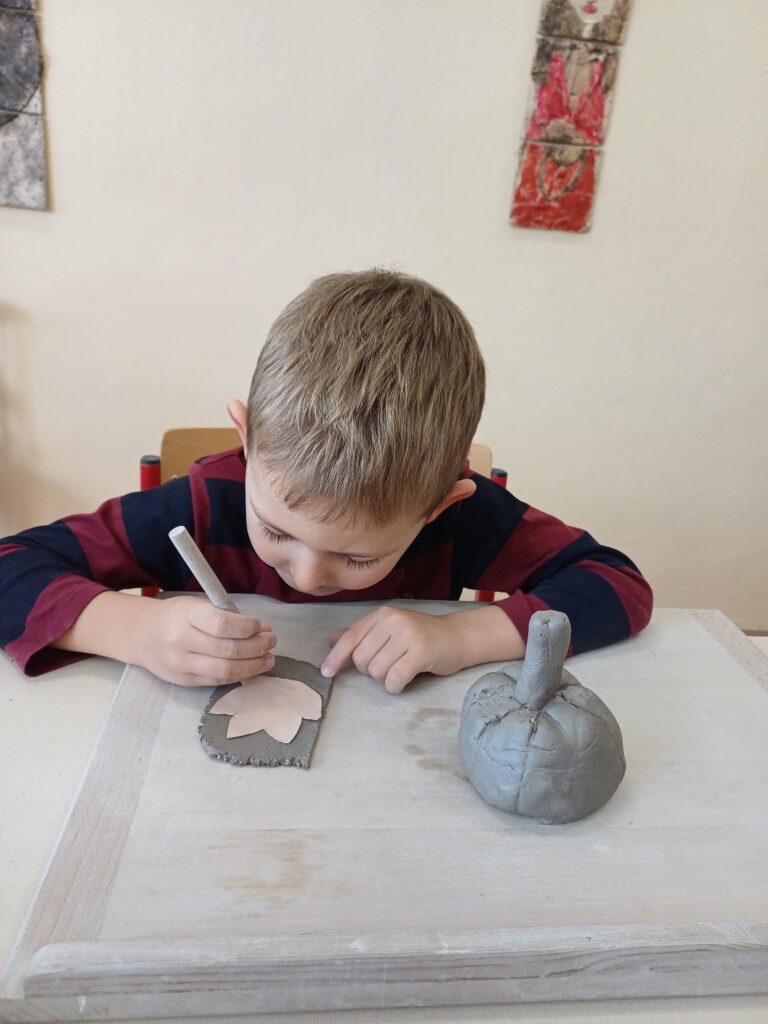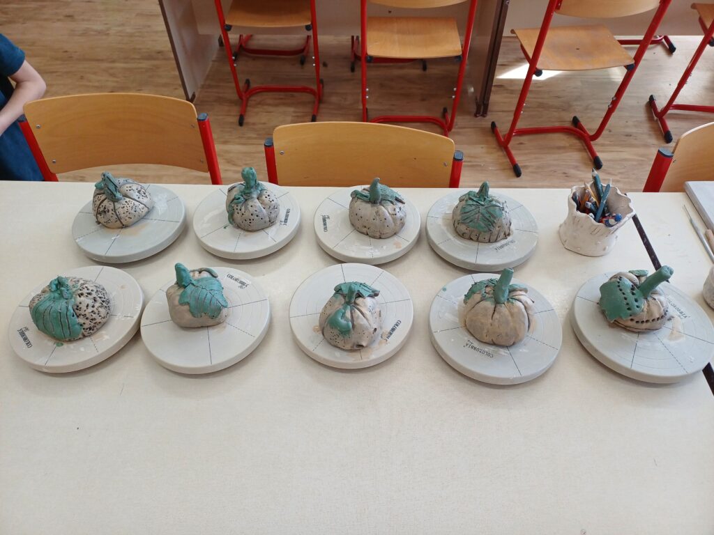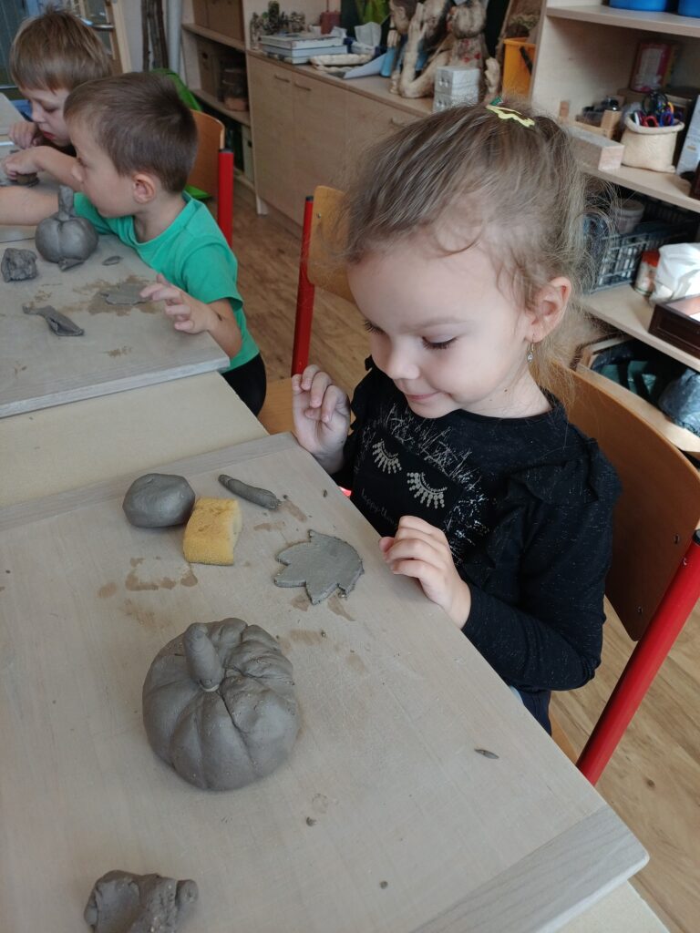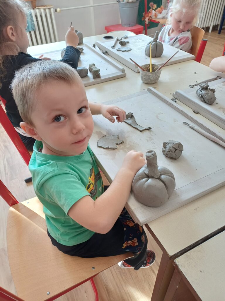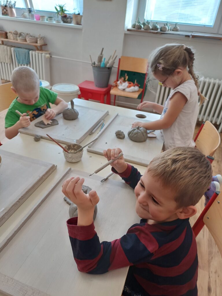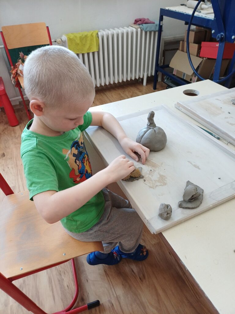 Každá dýně, kterou děti vytvořily, byla jiná, jedna zajímavější než ta druhá. S paní lektorkou si děti dýně zhodnotily, pozorovaly rozdíly v detailech i tvarech dýně. Každý výrobek byl originální a děti moc bavila práce s keramickou hlínou.
