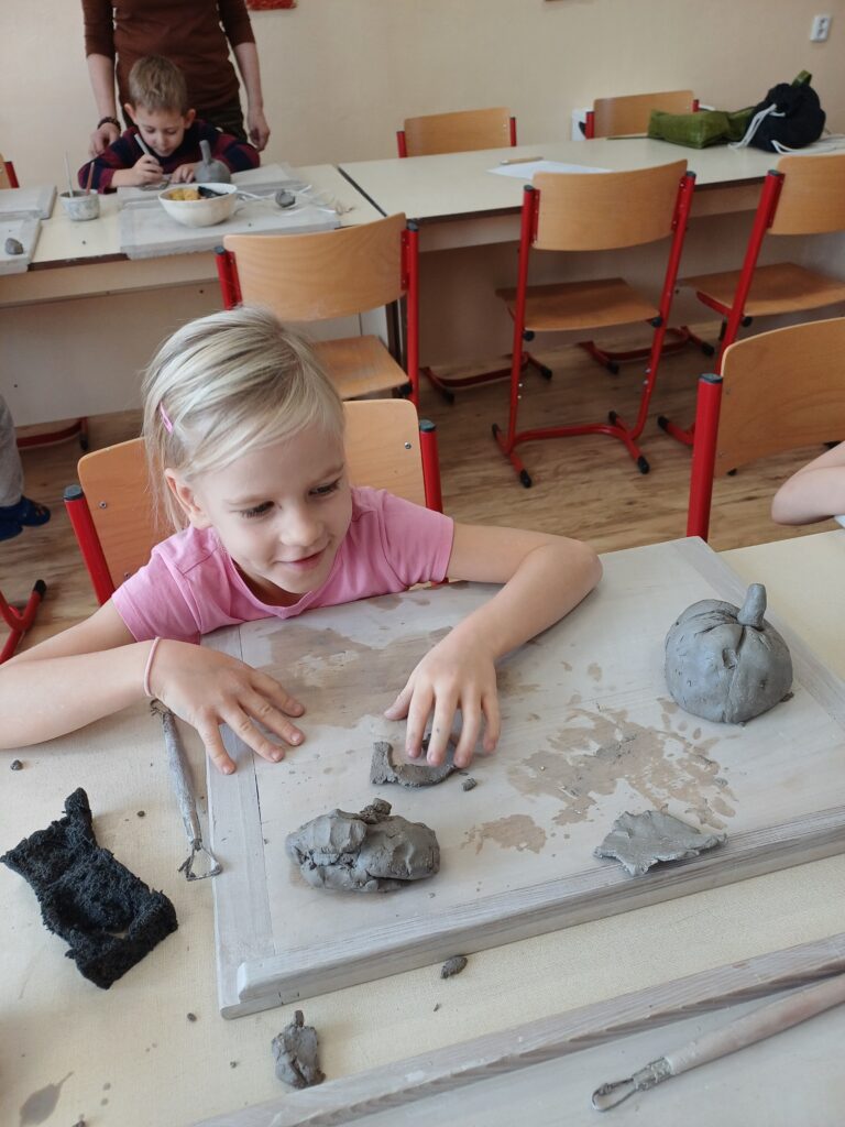 Děti navštívily Středisko volného času v Ostravě-Porubě, kde se zúčastnily keramiky. Tentokrát keramiku navštívily i mladší děti, které se nejprve s prací s hlínou seznámily. Z keramické hlíny měly děti postupně vymodelovat „Dýni.“ Na podložce si vymodelovali kouli, ze které potom dotvářeli tvar dýně. Některé detaily dýně dotvarovaly špachtlí, smyčkou nebo jemnou perforací pomocí tužky. Postupně děti připevnily k dýni i listy, které přilepily speciálním lepidlem (tzv. šlikrem) Ještě si děti na dýni nanesly barvu na keramiku – engobu. Děti použily jen dvě barvičky zelenou barvu listů a oranžovou barvu dýně.