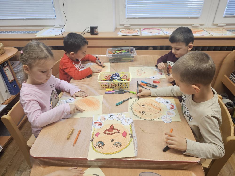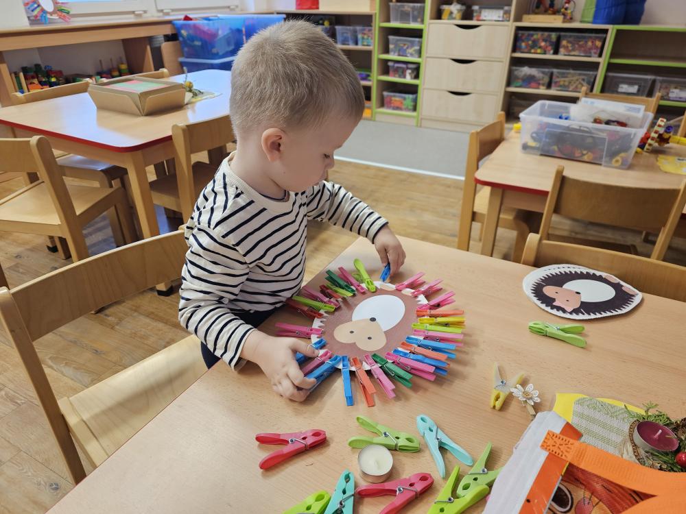 Ježkové dělali společnost nejmenším, kteří si připínáním kolíčků-bodlin procvičili jemnou motoriku s hmatem dohromady. Pavoučci s čísly pomohli starším dětem se zrakovým rozlišením a počítáním do 10. Také si procvičily přirovnávání stejného počtu v různém obrazovém značení.