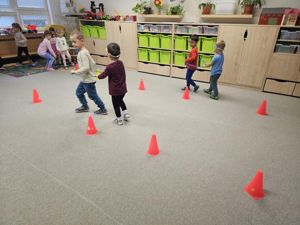 Posléze jsme si zahráli spoustu zajímavých smyslových her. Se zavázanýma očima jsme rozlišovali materiály a hledaly dvojice, pomocí sluchu jsme vyhledávaly dvojice stejně znějících kostek. V prostoru jsme se zkoušeli orientovat bez zraku a to pomocí zvuku zvonečku nebo pomocí vodícího kamaráda.