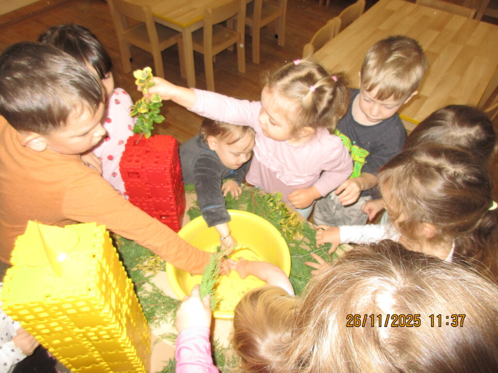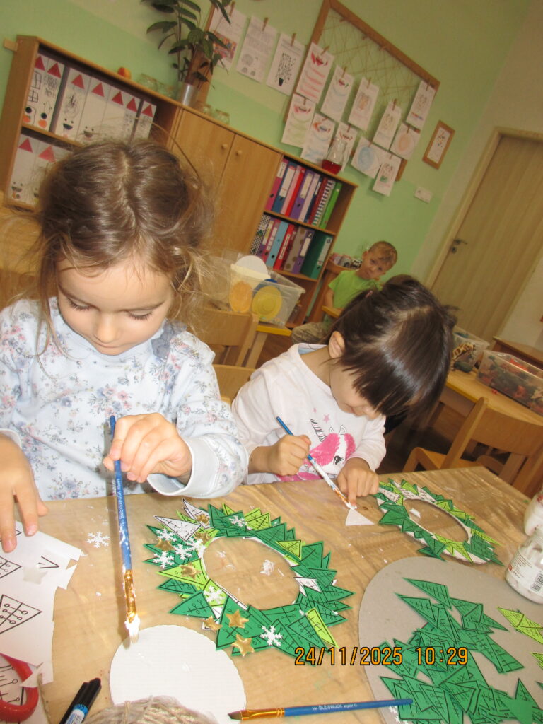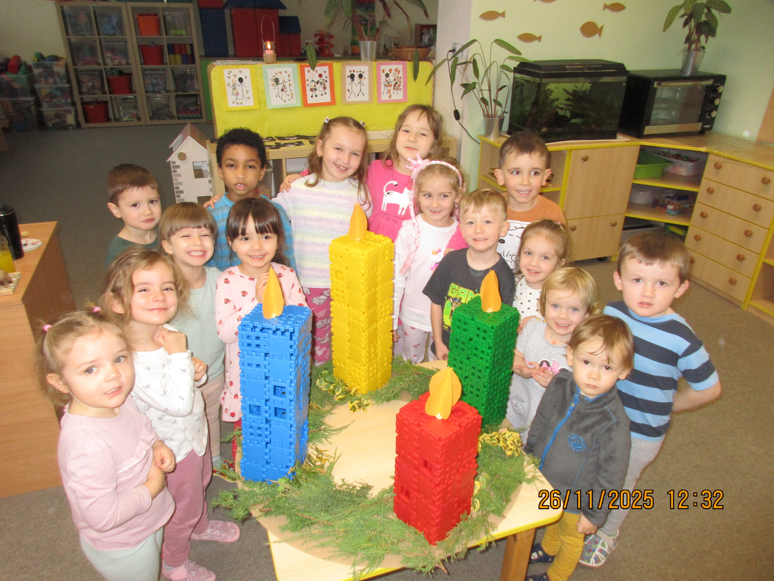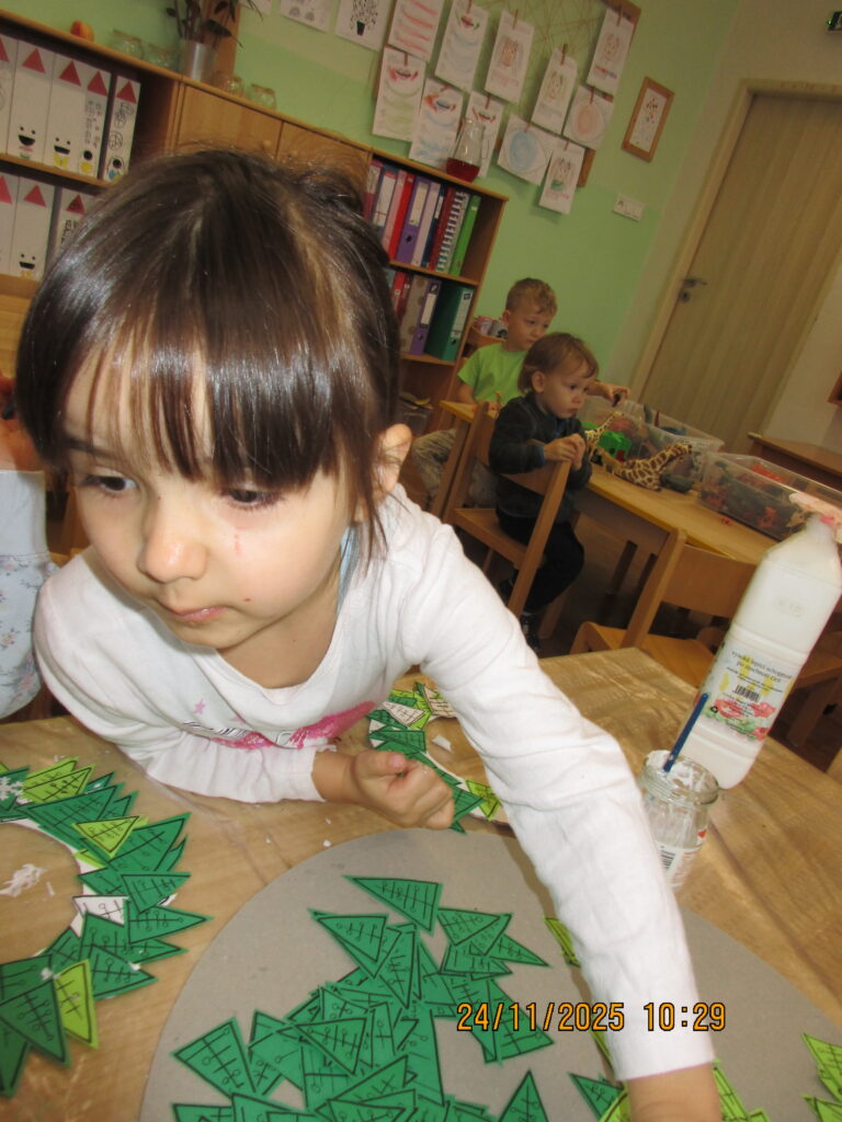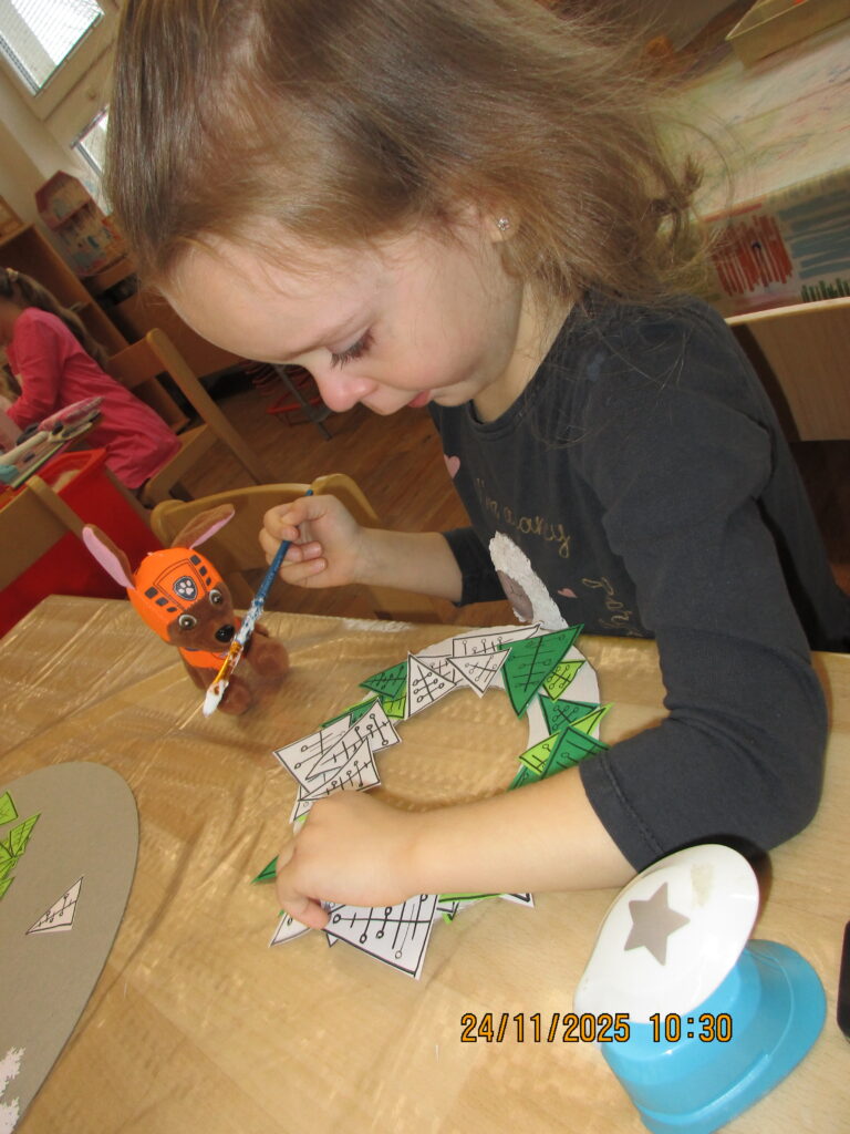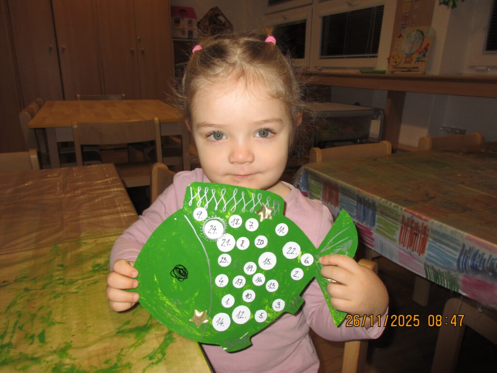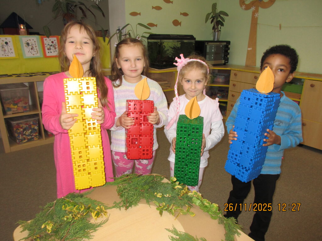Děti seznámeny s obdobím, kterému říkáme Advent. Vyráběly si adventní kalendář- kapříka, adventní věneček na zavěšení a velký věnec se svíčkami ze stavebnice – seznámeny s významem svíček.