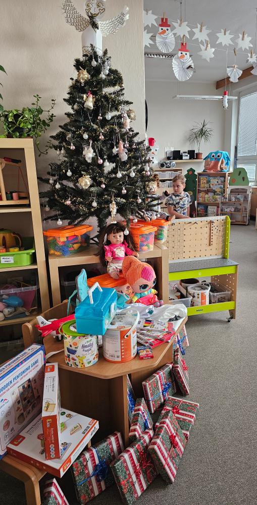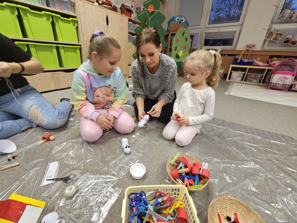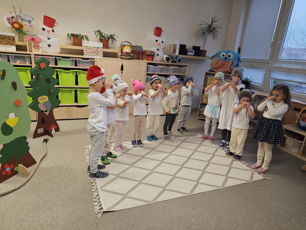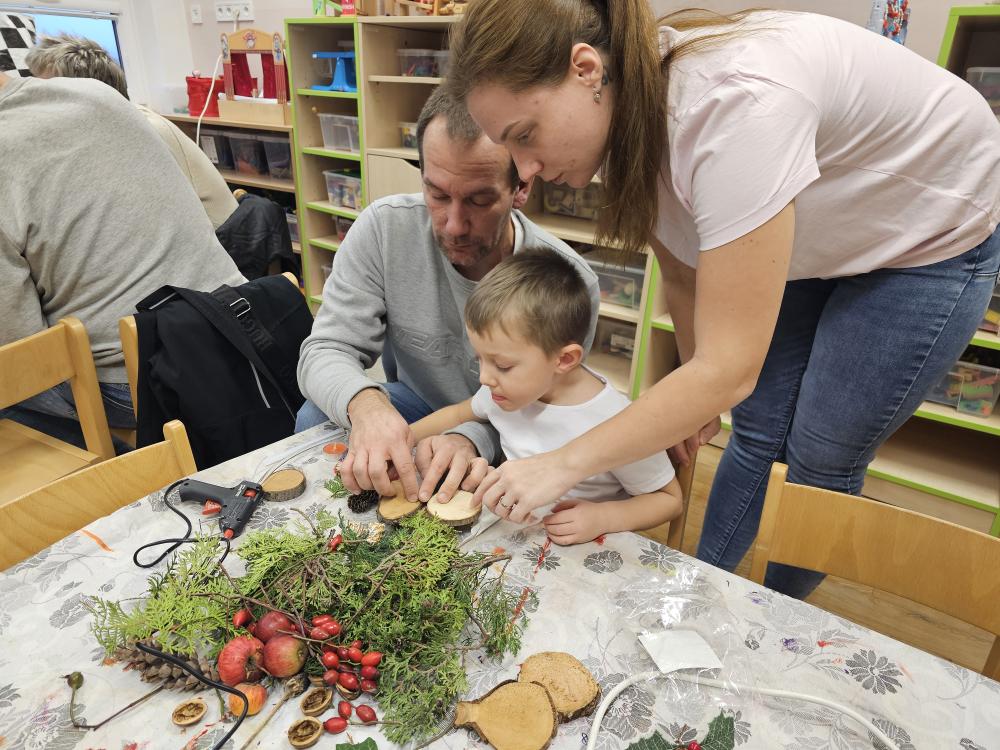 Letos jsme uspořádali vánoční dílničky pro rodiče v zimním duchu s dětmi, jako sněhuláčky. Krátké vystoupení dětí naplněné zimními básničkami a hudebně pohybovými hrami rozveselilo výraz v obličeji nejen dětem, ale i rodičům. Zúčastnění rodiče měli na závěr vystoupení možnost si se svou ratolestí zatančit hudebně pohybovou hru Dva mrazíci. Na chvilku se z dětí stali učitelé a vedli svého tatínka a maminku k neuvěřitelným tanečním výkonům. A jak jim to všem, panečku, klapalo, to byste koukali!