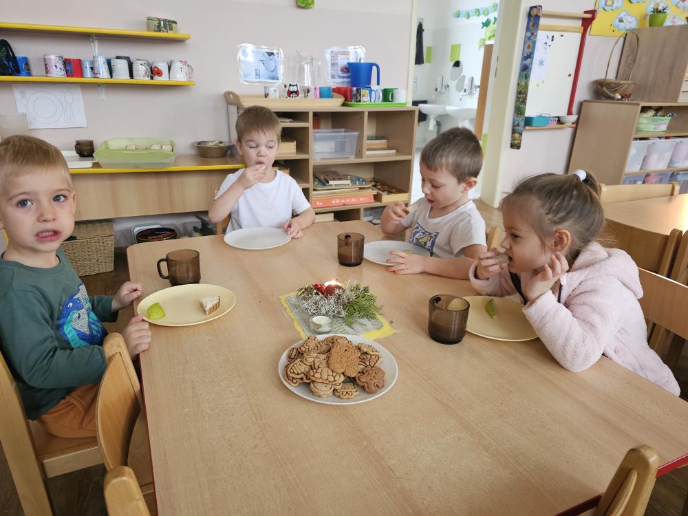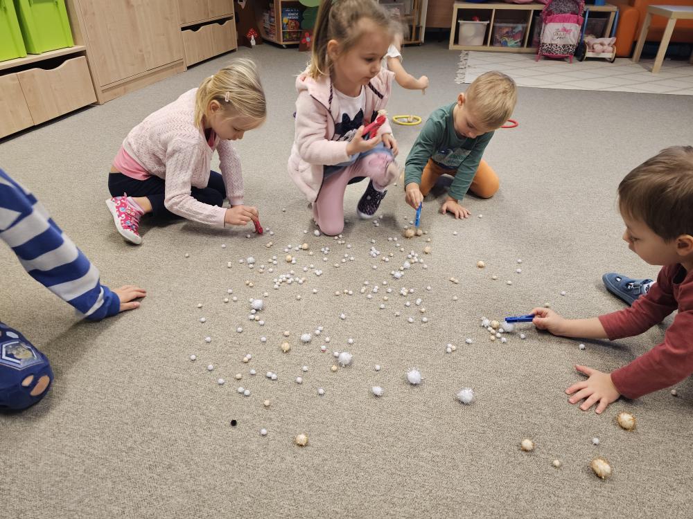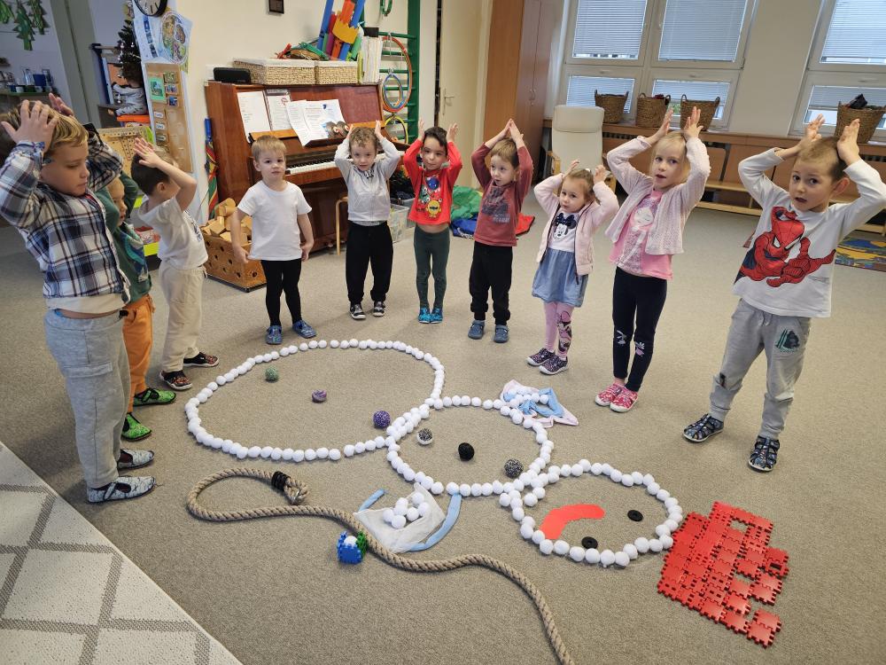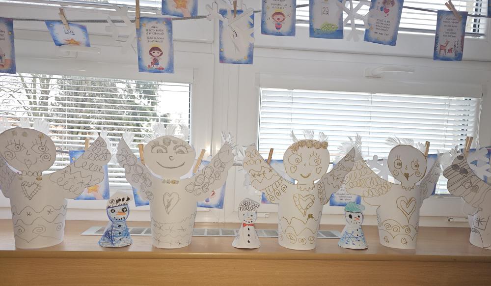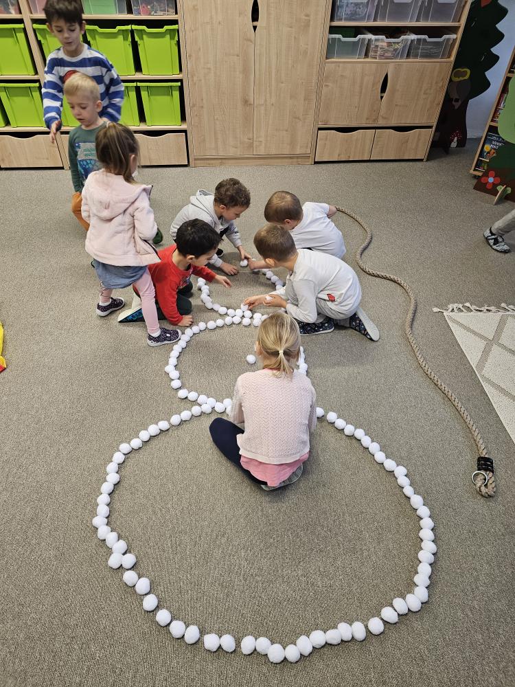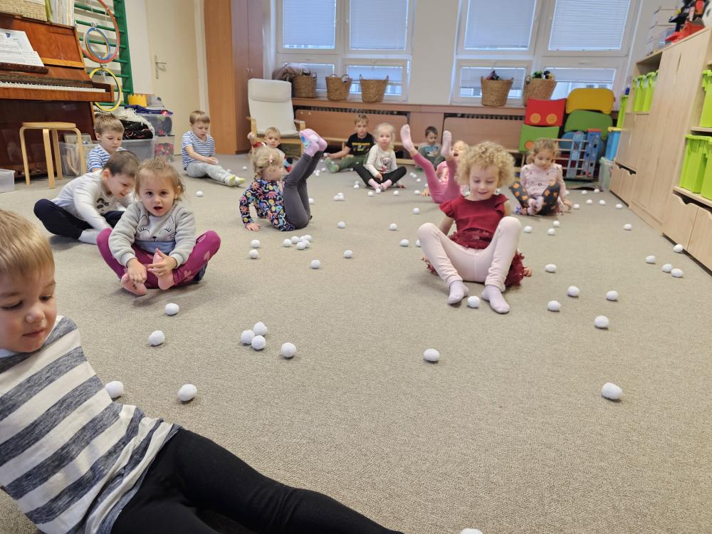 V posledním adventním týdnu se už děti nemohou dočkat toho tajemného dění okolo Štědrého dne. Ve třídě jsme vytvářely různé aktivity. Ze sněhových koulí jsme stavěly formou kooperační činnosti sněhuláka nadměrné velikosti. Házeli jsme koulemi na cíl a koulovali jsme se mezi sebou, cvičili s kouličkami dle hudby. Sbírali jsme stříbrné drobné bambulky kolíčkem, rozvíjeli si jemnou motoriku, porovnávali velikosti i počty a tvořily mozaiky do vánoční baňky.