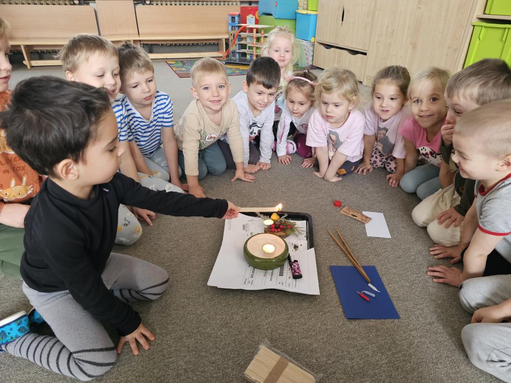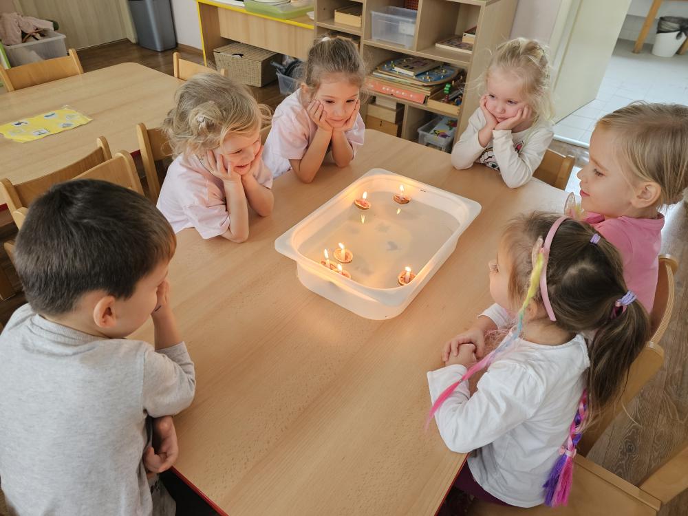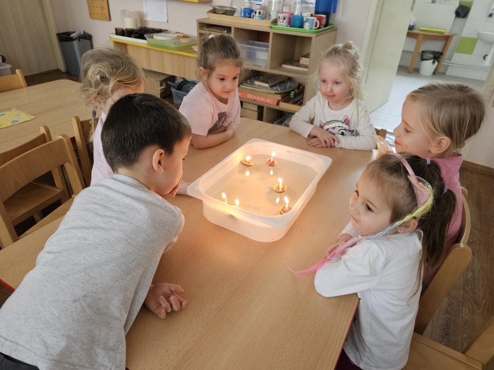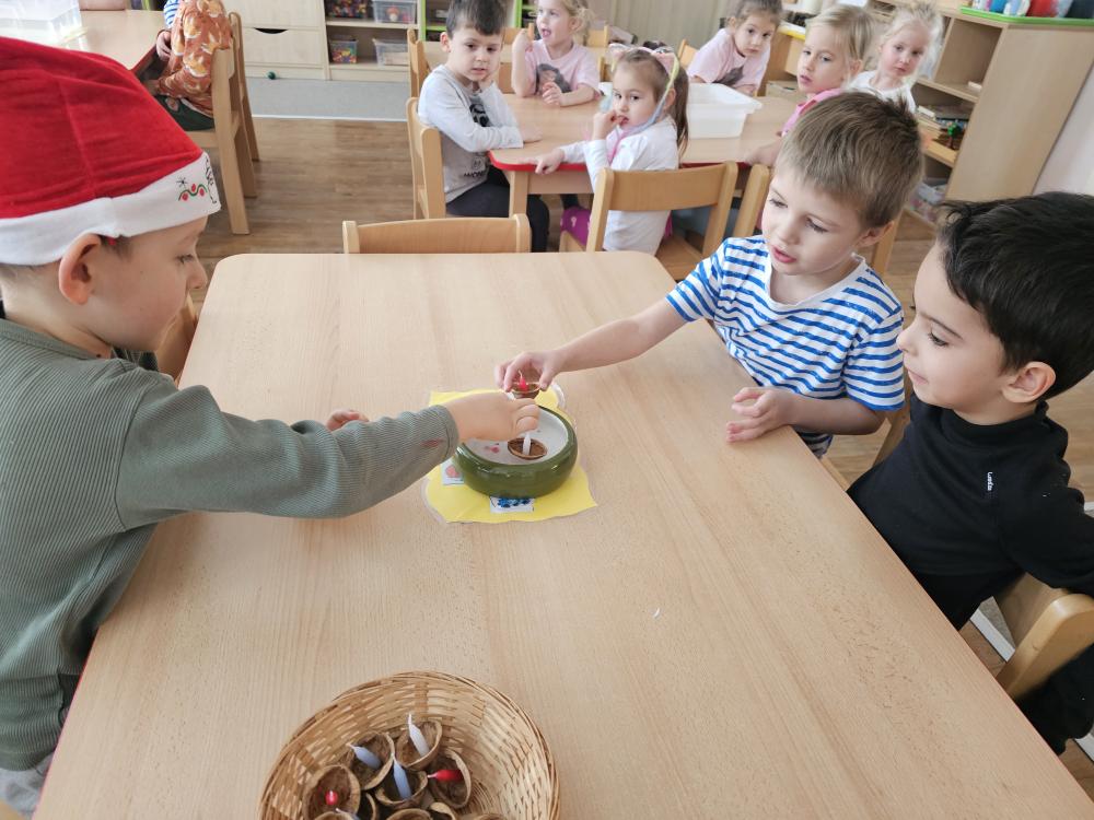 Z ořechových skořápek se staly lodičky a děti se seznámili s vánoční tradicí pouštění lodiček po vodě. A protože jsme používali oheň na svíčce, poučili jsme se o maximální bezpečnosti. Vysvětlili jsme si taktéž, že: Oheň je sice dobrý sluha, ale špatný pán. Zvládli jsme i pár pokusů v duchu zjištění co hoří z vybraných předmětů a měli jsme možnost pozorovat hořlavost z bezprostřední blízkosti. To všechno nám umocnily hrané i zpívané koledy a zimní písně.