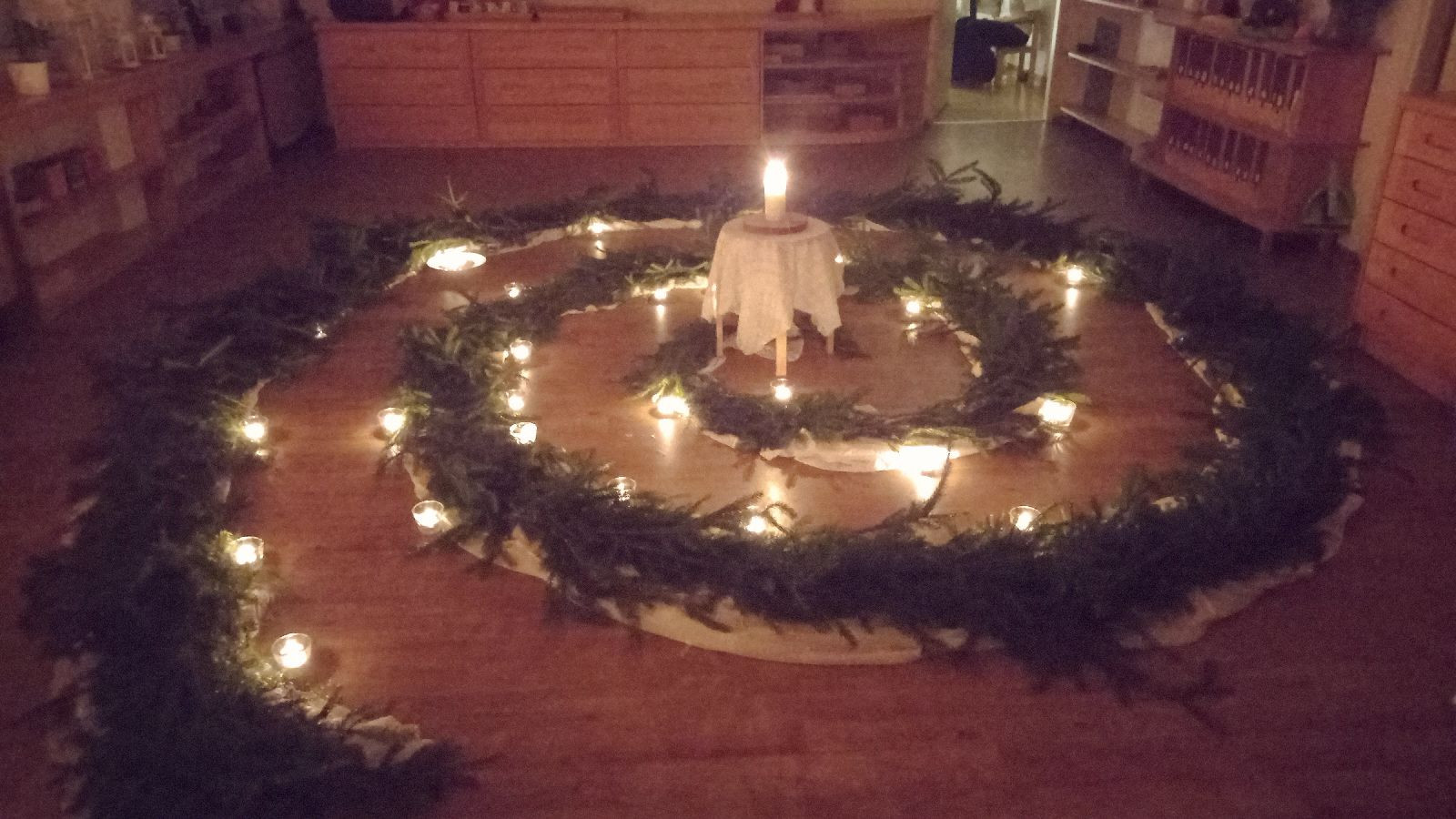 Paní učitelky pro děti připravily spirálu ze zeleného chvojí a bílých sněžných šátků. Na děti čekali ve třídě andělé. Děti si prožily cestu spirálou společně s andělem. Zapálili si svíčku a cestou zpátky jí našli libovolné místo po spirále, kde ji mohli položit.