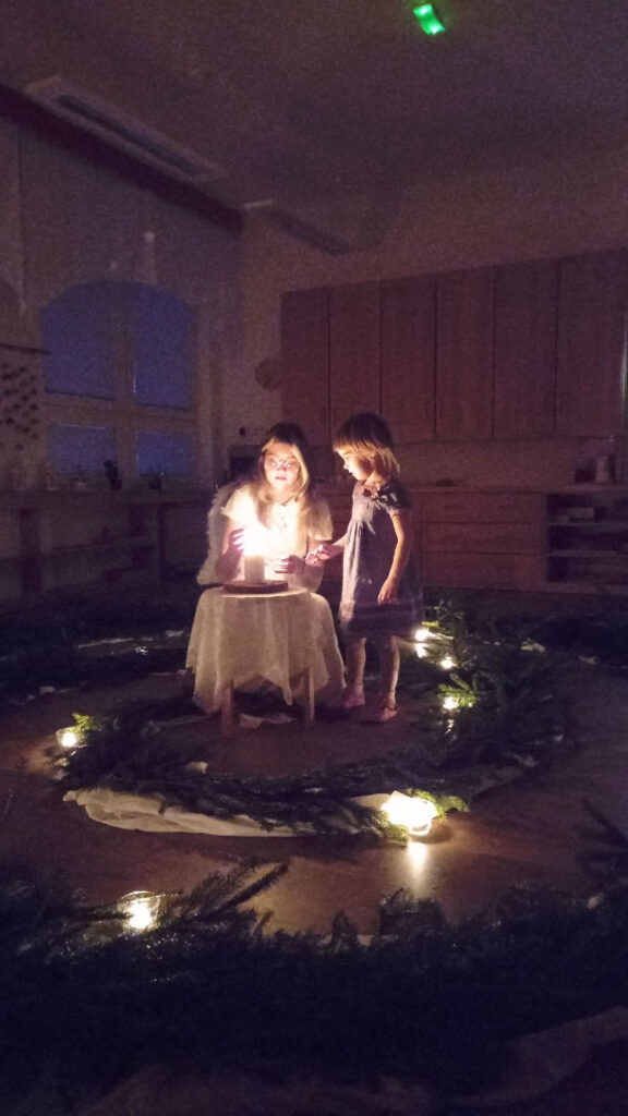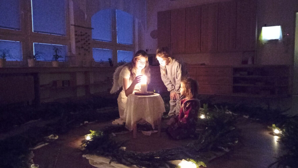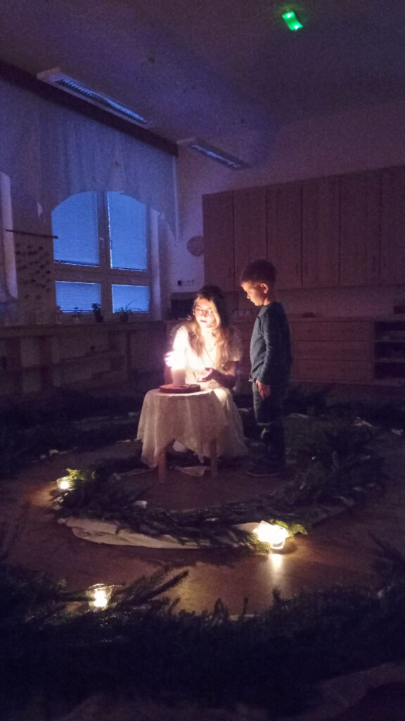 Celá tato tradice se odehrává v komorním duchu za příjemného šera, kdy nám dávají světlo pouze svíce. V blízkosti třídy nám hráli a zpívali koledy andělé z waldorfského lycea. Tento společně strávený večer se nám pedagogům líbil a věříme, že si z něj i děti a jejich rodiny odnesly příjemný zážitek a tolik potřebné světlo i teplo v srdíčku do dalších dní.