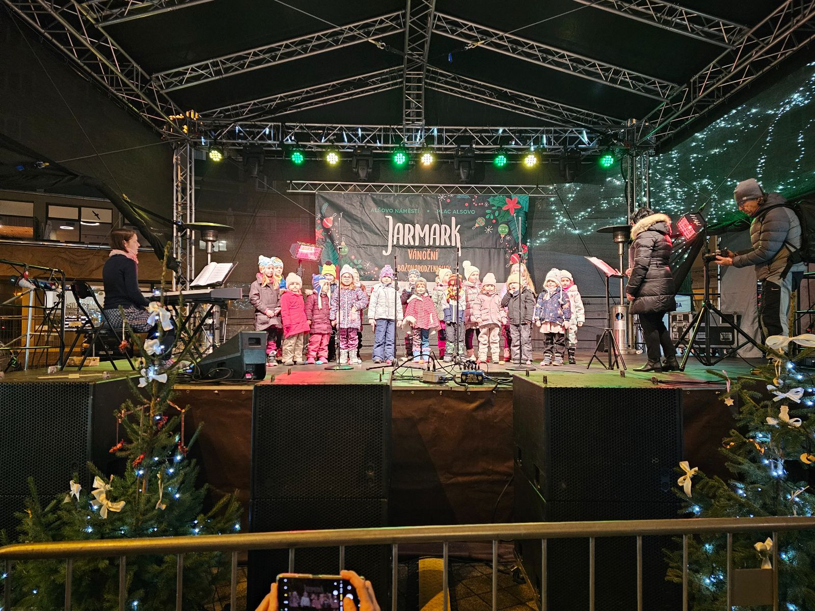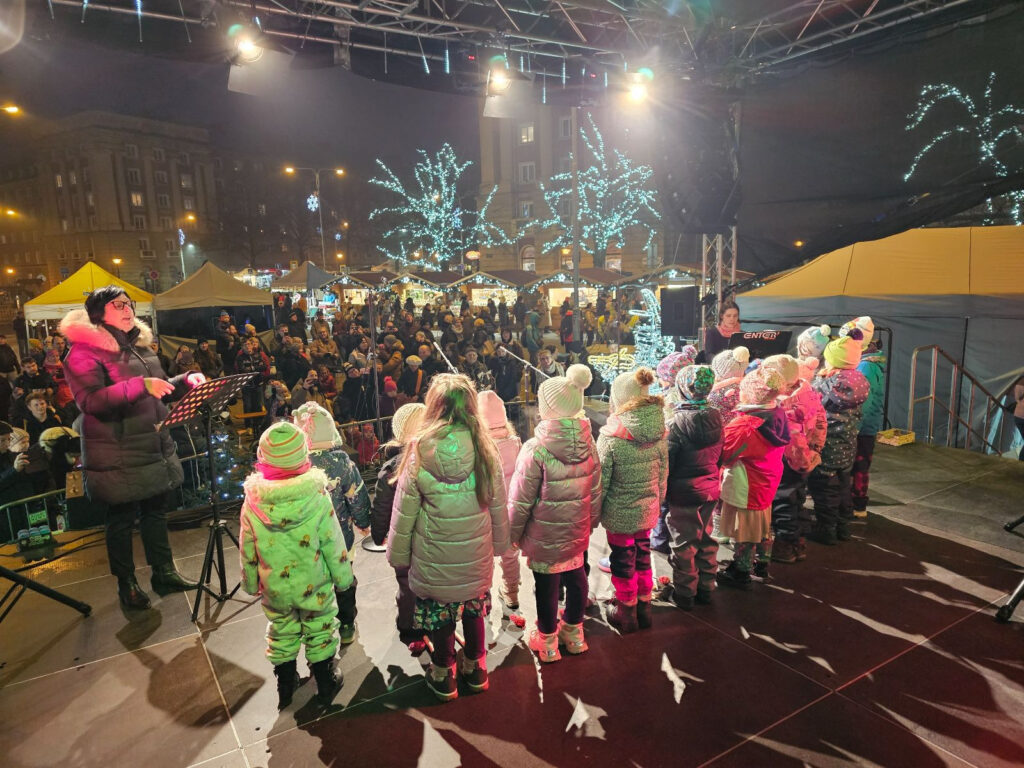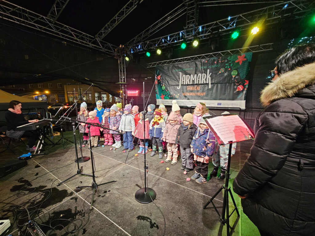 V úterý 2. 12. 2025 vystoupily děti, které navštěvují sboreček Zvoneček, na Alšově náměstí v rámci vánočního jarmarku. Tento školní rok to bylo poprvé, kdy se postavily na pódium před diváky a jak jsme mohli vidět, nebylo o ně nouze. Byla to tedy veliká výzva pro všechny děti. Ale s odvahou se tomu postavily, výzvu přijaly a mnozí můžou posoudit, že se jim to velice povedlo!