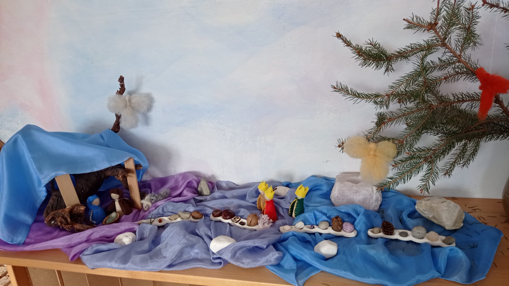 Kdo kdy navštívil naši třídu, již zná Roční stoleček. Je to místo, které odráží uměleckým pohledem a ztvárněním období, které s dětmi zrovna prožíváme. V období Adventu nás zaměstnalo téma adventní cesty Josefa, Marie a oslíka do města Betléma.