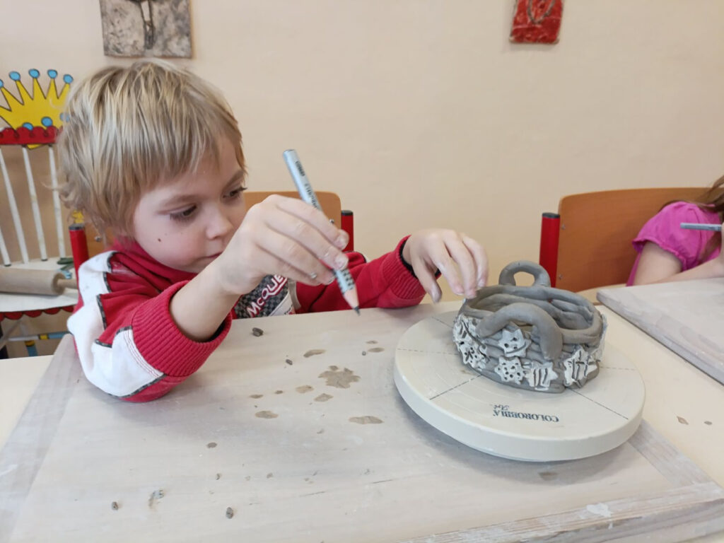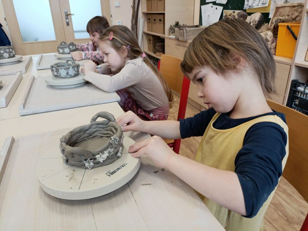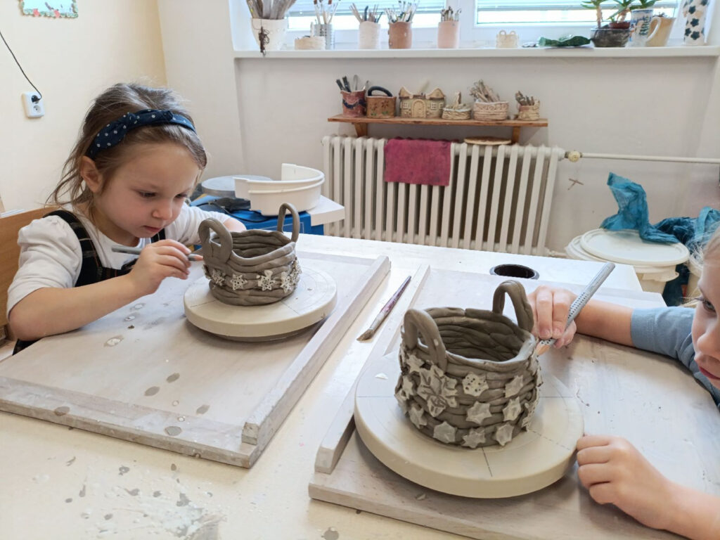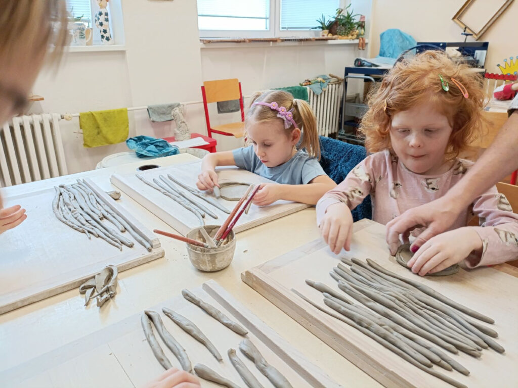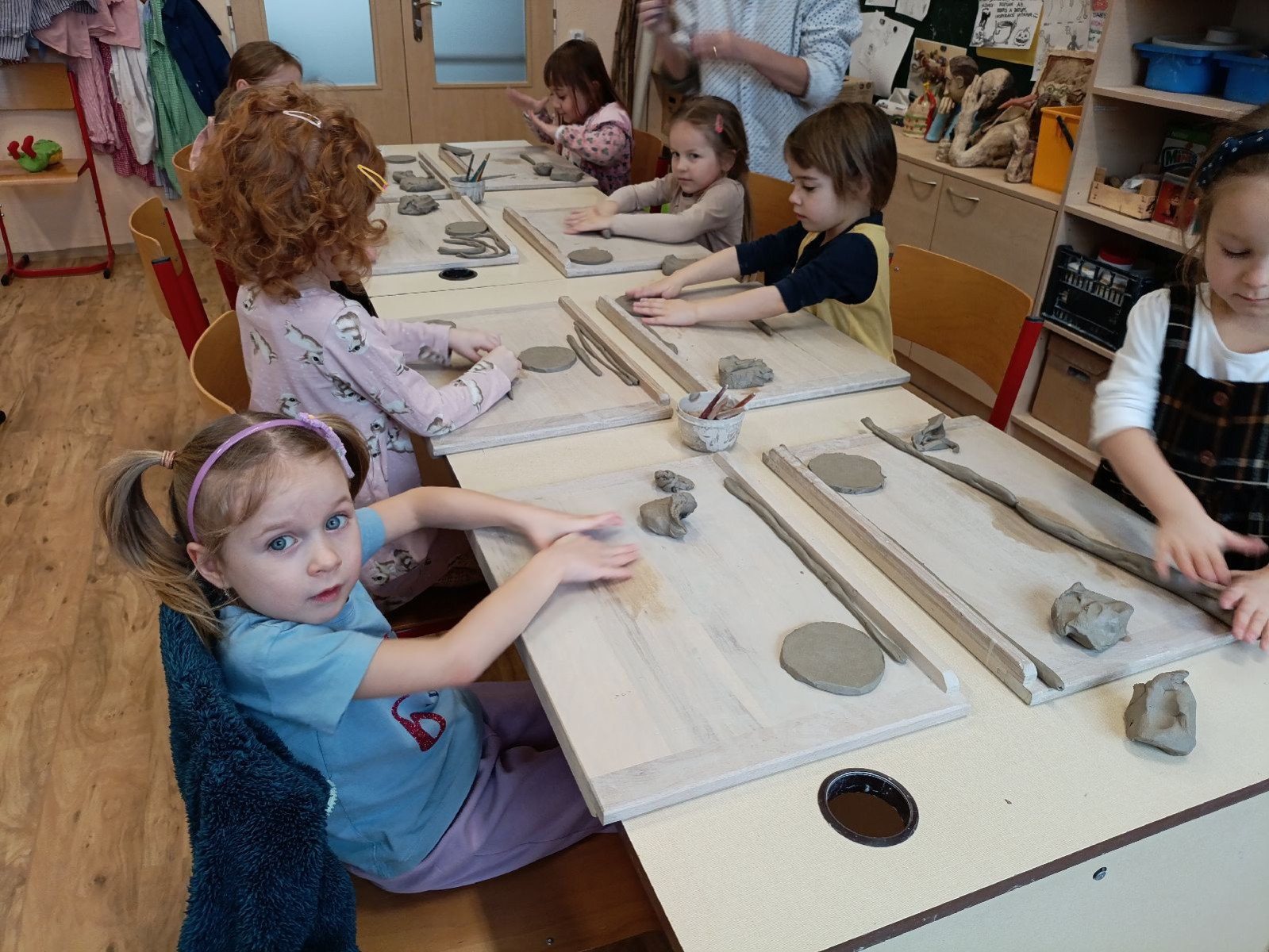 Vždy nás na místě čeká hodná a velice šikovná paní pedagožka keramiky, která má pro nás nachystány hromady hlíny. Společně, a přece každý sám, tvoří děti krok po kroku výrobek, který si následně slepí lepidlem a nabraví barvami.