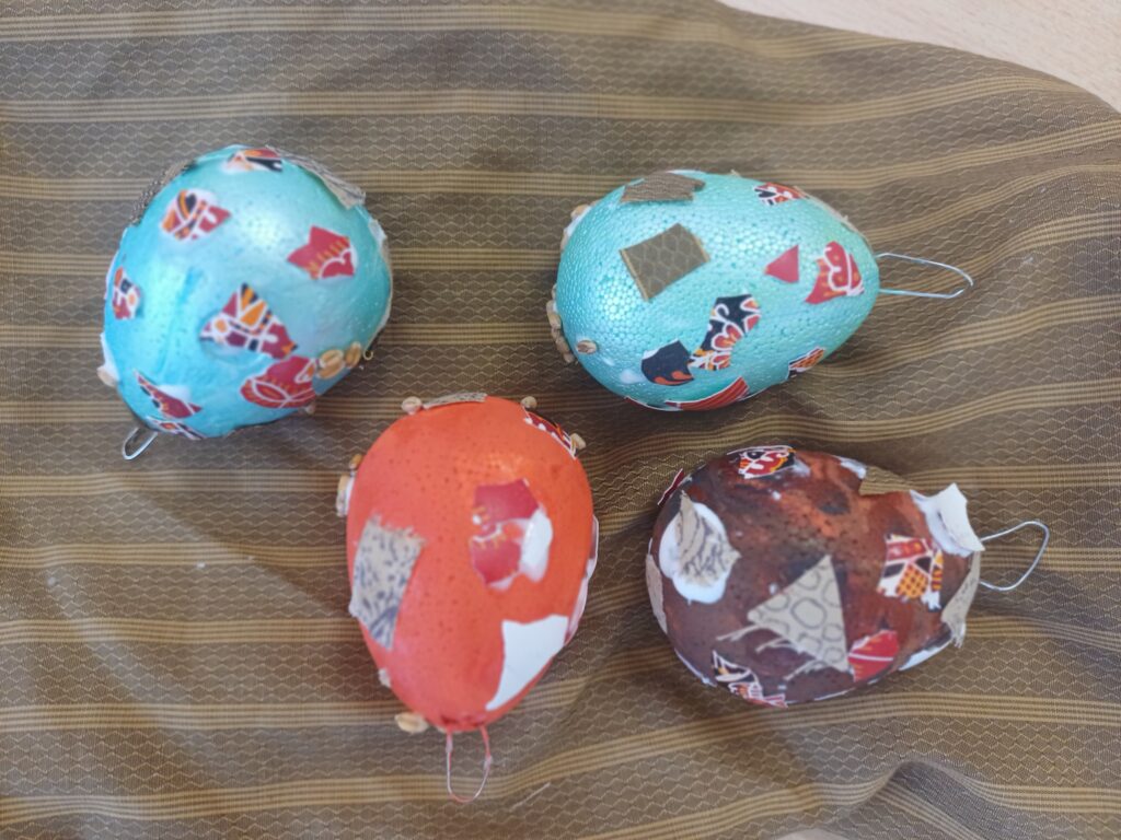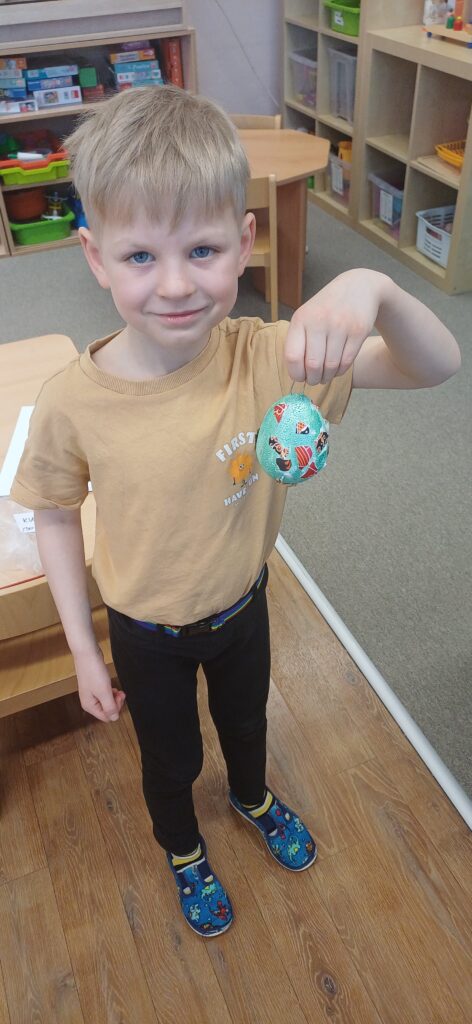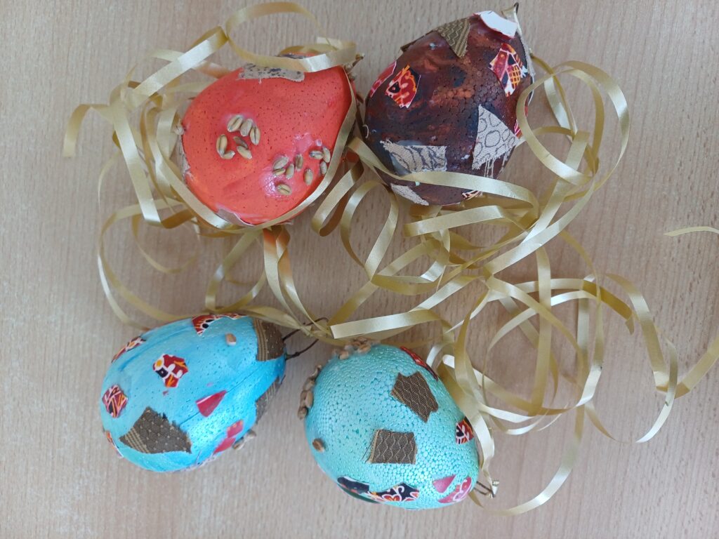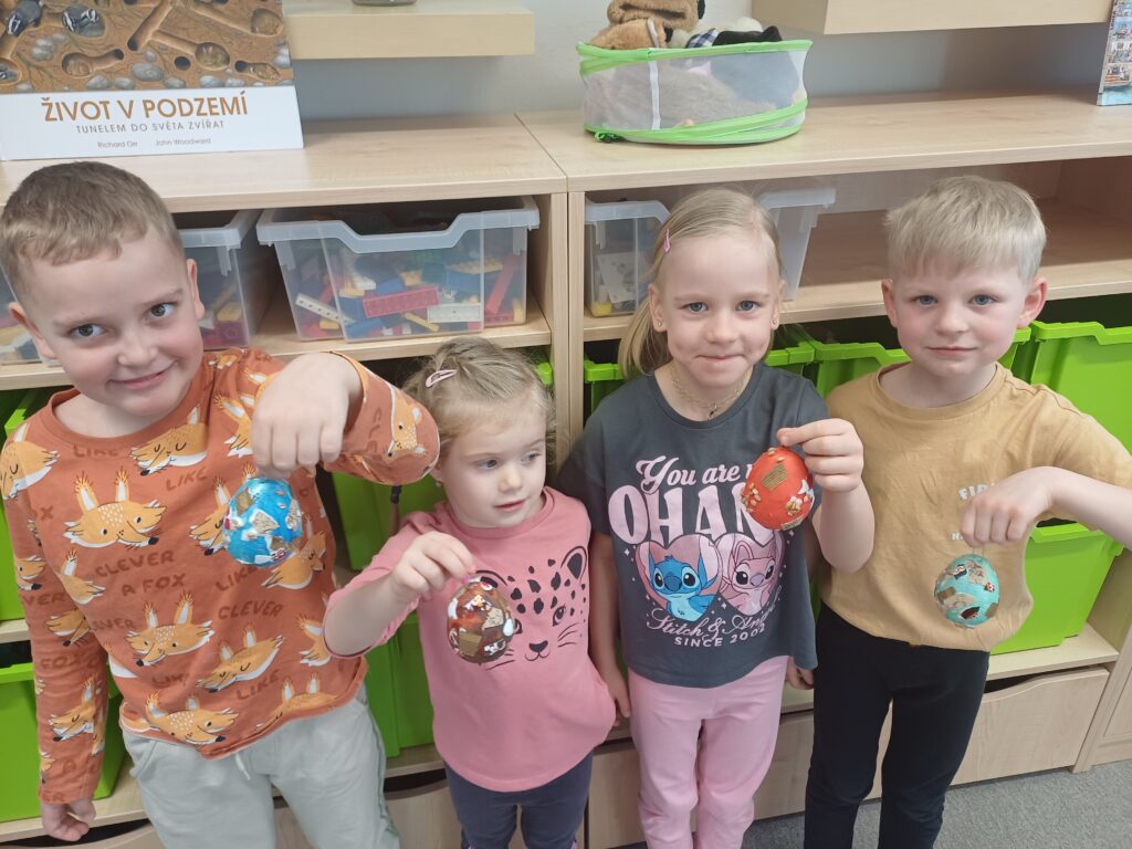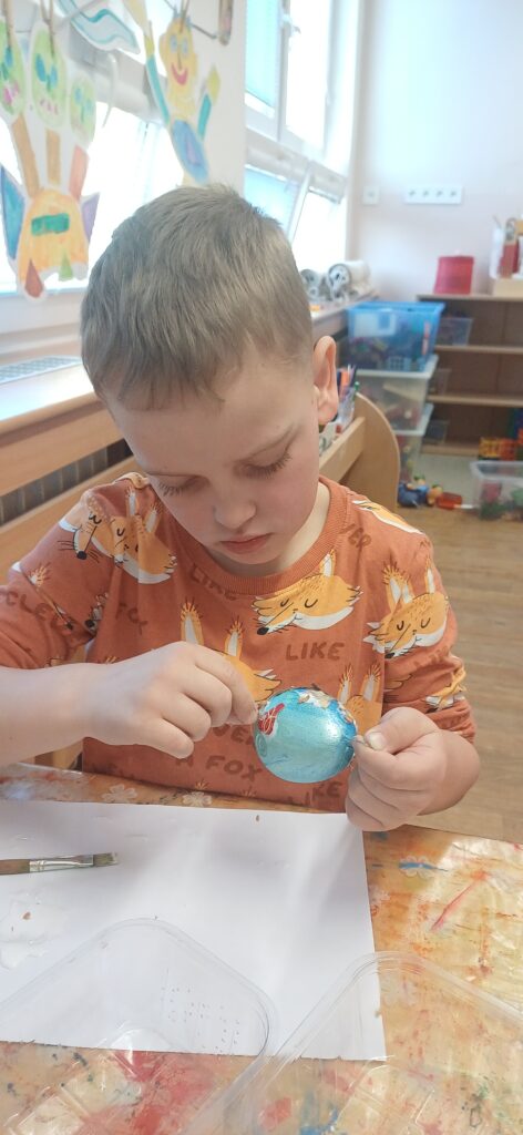 Děti ze tř. KUŘÁTKA zdobily velikonoční vajíčka. Nejprve je vymalovaly akrylovými barvami, poté na ně lepily zrníčka, kousky textilie a skořápky z vajec.