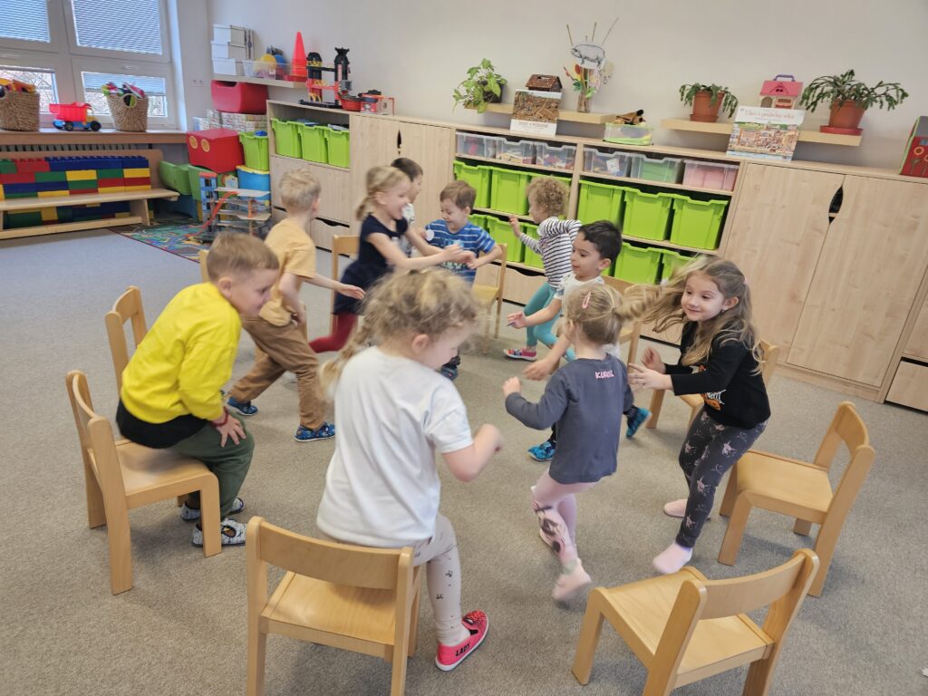 Pohybové hry, ať už honičky, dramatické nebo hudební jsou nedílnou součástí každého tématu a rozvíjejí nejen pohybovou stránku dětí, ale také upevňují nové poznatky.