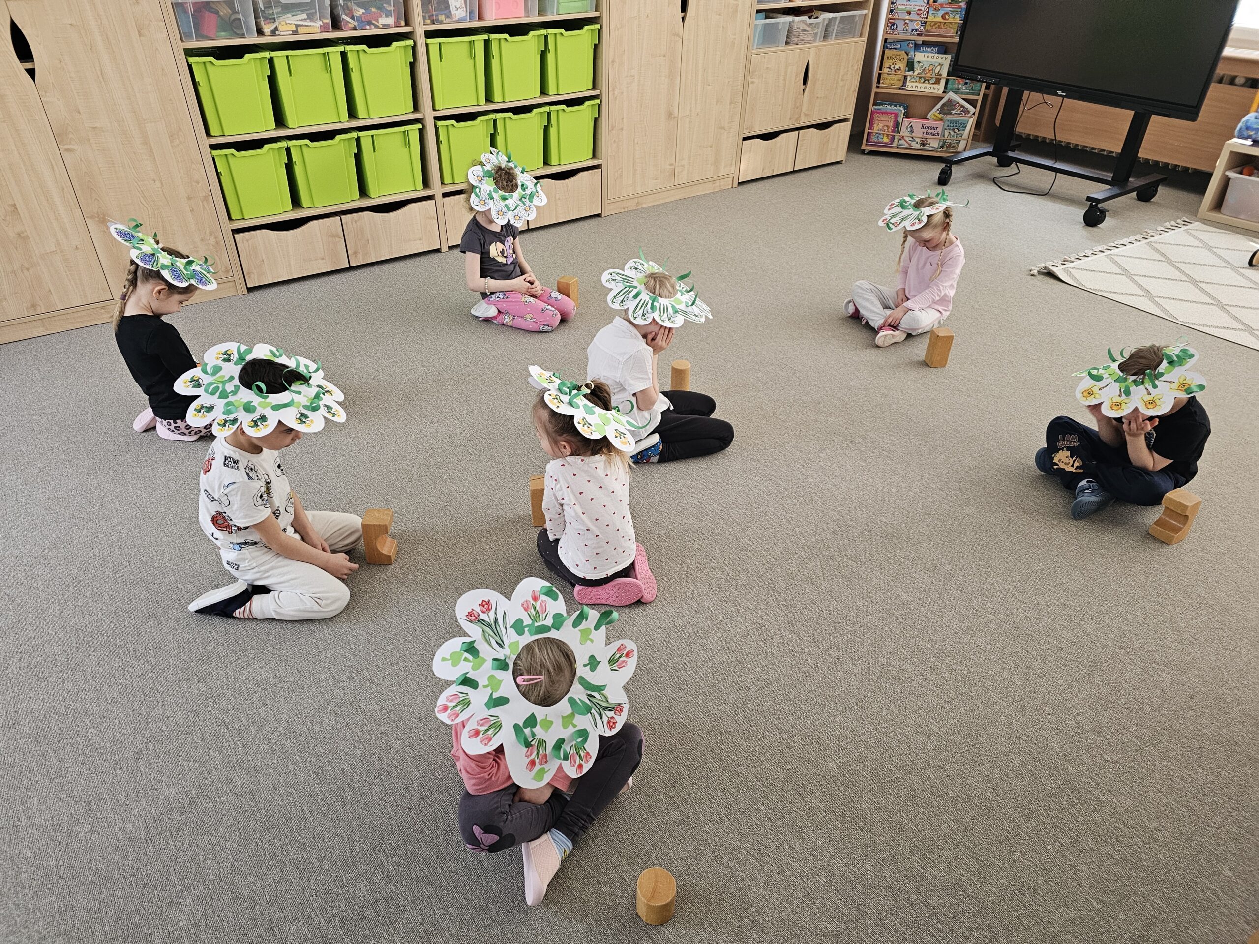 V hudebně pohybové hře Uvíjíme věneček děti využily vlastním tvořením květinové věnečky a spojily zpěv s pohybem a upevňováním názvů květin.