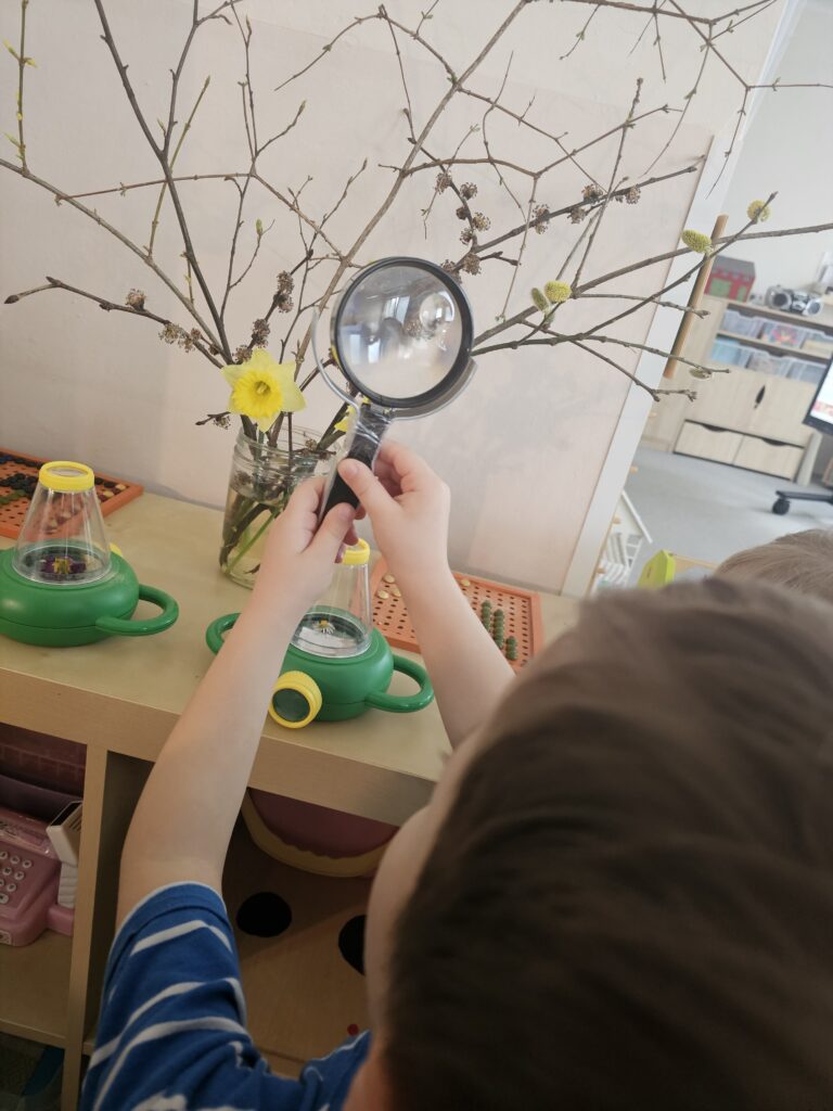S tématem jarní probouzení měly děti možnost zkoumat květiny zblízka. Pomocníkem byly lupy různého druhu a pokusy.