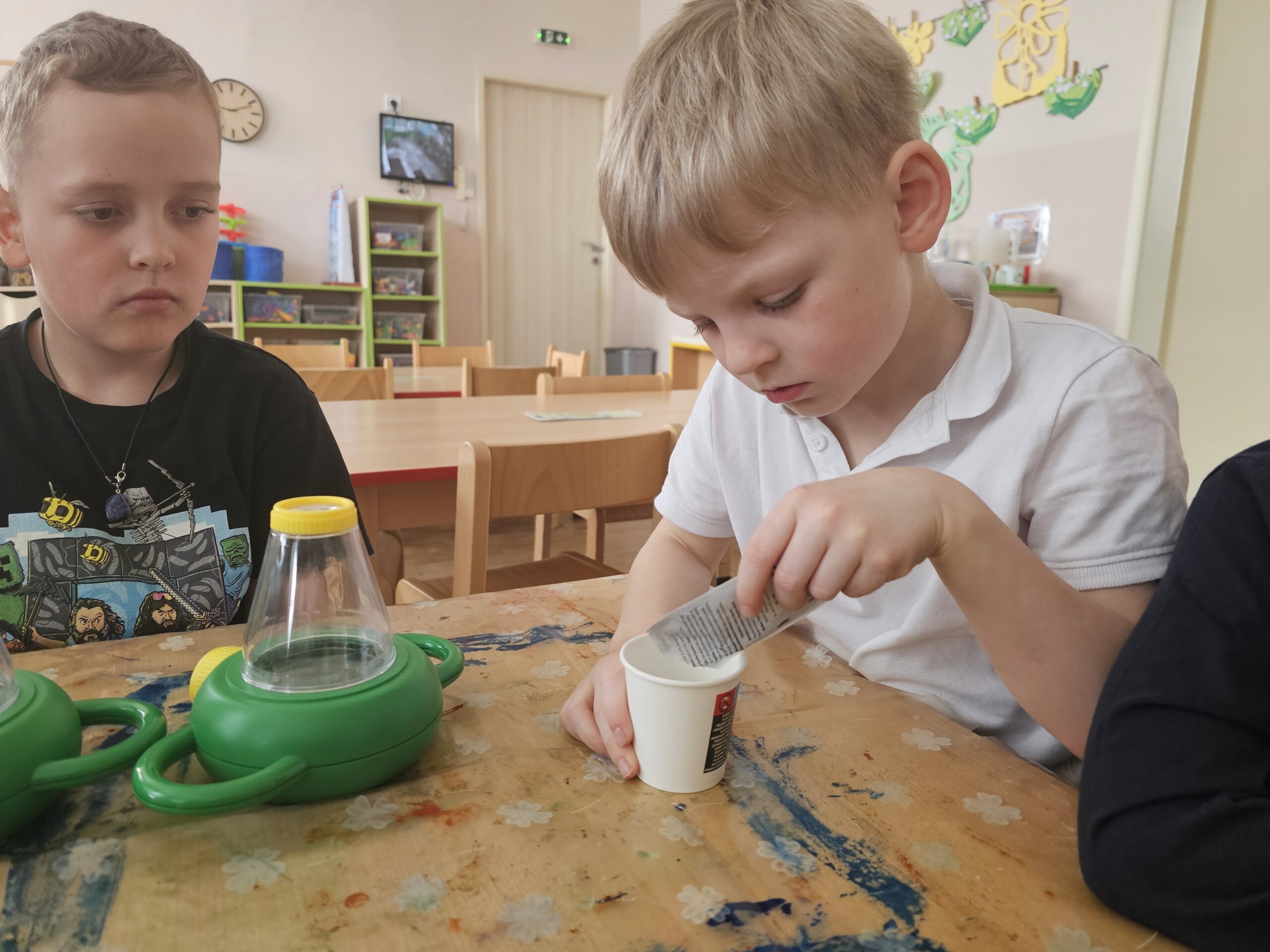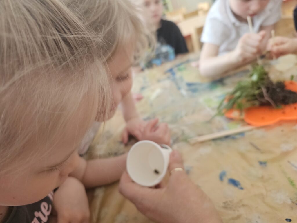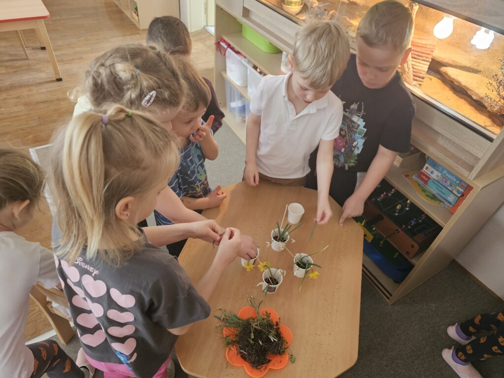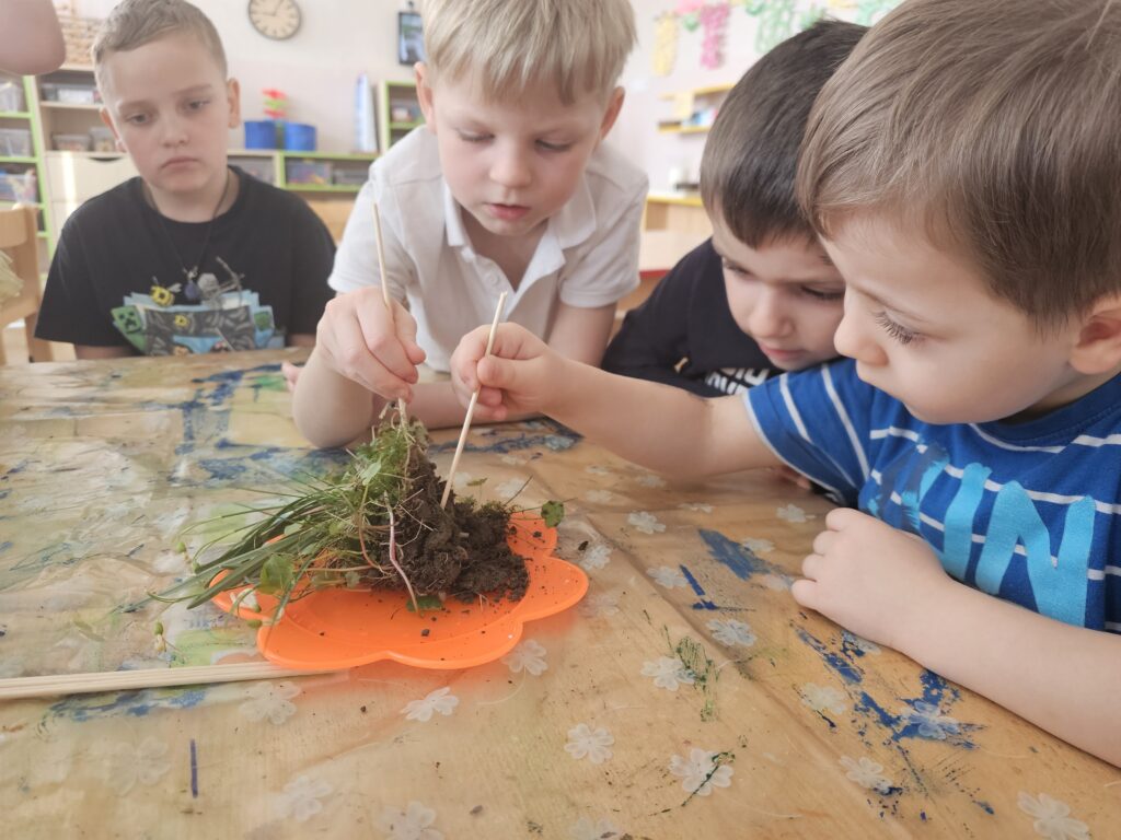 V jednom pokusu jsme rychlili větévky, uschlé květiny v květináčích jsme pozorovali a mohli vyvodit, jak květiny přijímají vodu. Zkoumali jsme kořínky, cibulky, hlínu, žížaly i broučky lezoucí z hlíny.