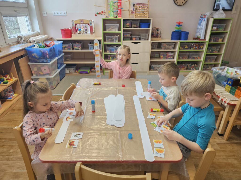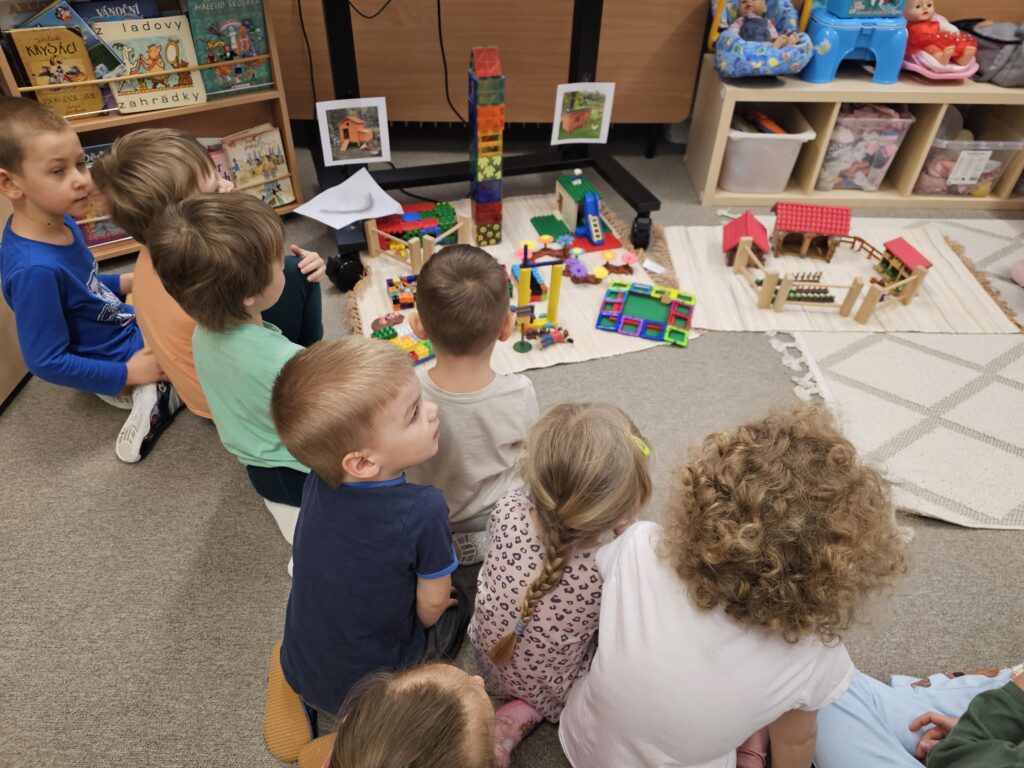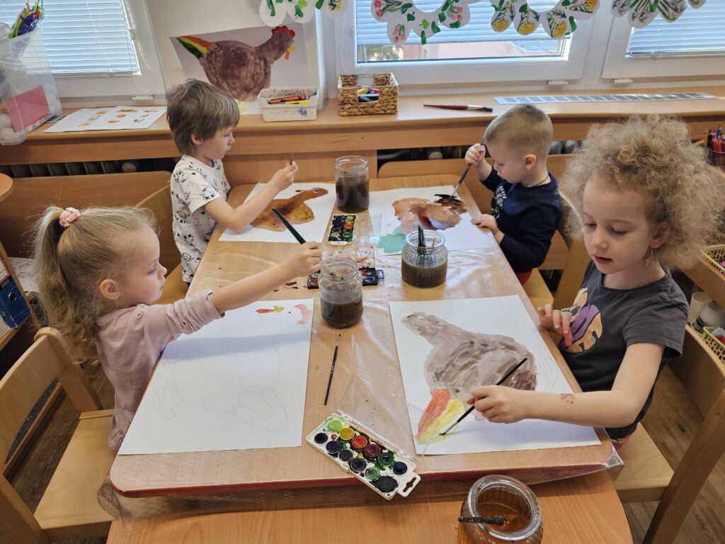 Malovaly jsme slepičku vodovými barvami a hrály pohybovou hru Na lišku a kuřátka. V kooperační hře tvořily děti konstruováním ze stavebnic hnízda a kurníky a porovnávaly s fotografiemi reálných domečků pro drůbež.