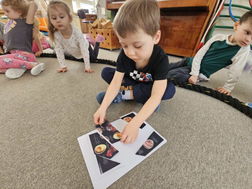 Shlédli jsem krátký, ale krásně popisný dokument o vývoji embrya ve vajíčku a seznámili se s koloběhem života jedné slepice. Cyklus života v obrázcích jsme si pak vystřihly a nalepovaly ve správné posloupnosti.