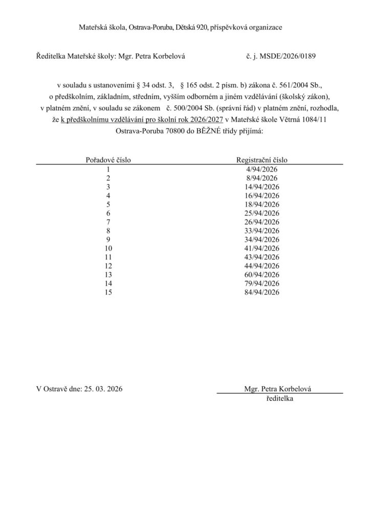Mateřská škola Větrná 1084, Ostrava-Poruba, 70800